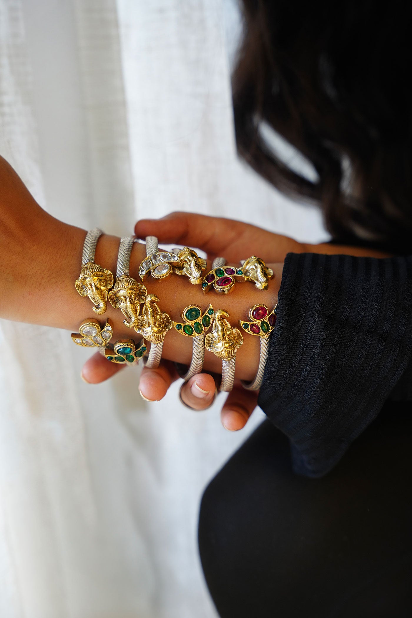 Sculpted in dual-tone metal with regal elephant heads and colourful stone details such as ruby, emeralds, & polki- Wear them as a solo statement or stack them fearlessly.