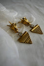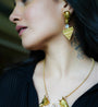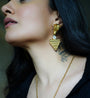 Featuring a sharp, triangular earring flanked by twin motifs and topped with a kundan drop, this piece is equal parts warrior and goddess, Crafted in a matte antique gold finish with fine ridged detailing - layer it over a high-collared silhouette for full drama.