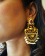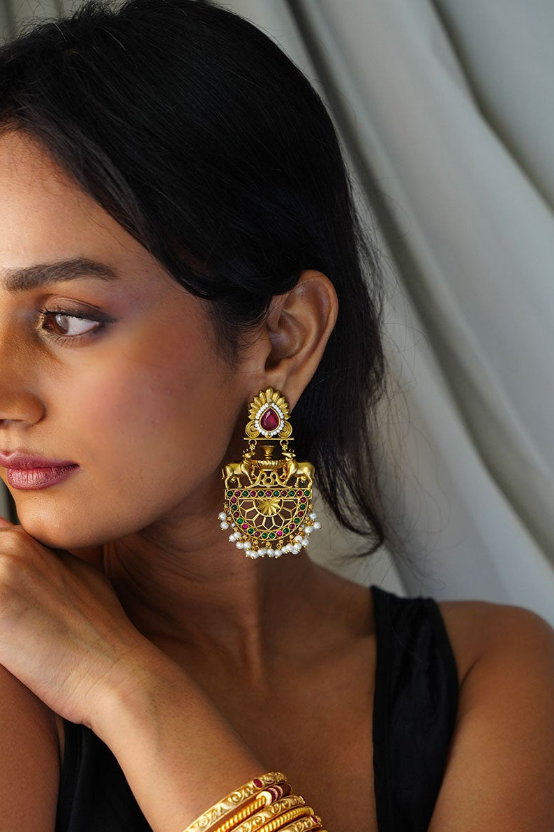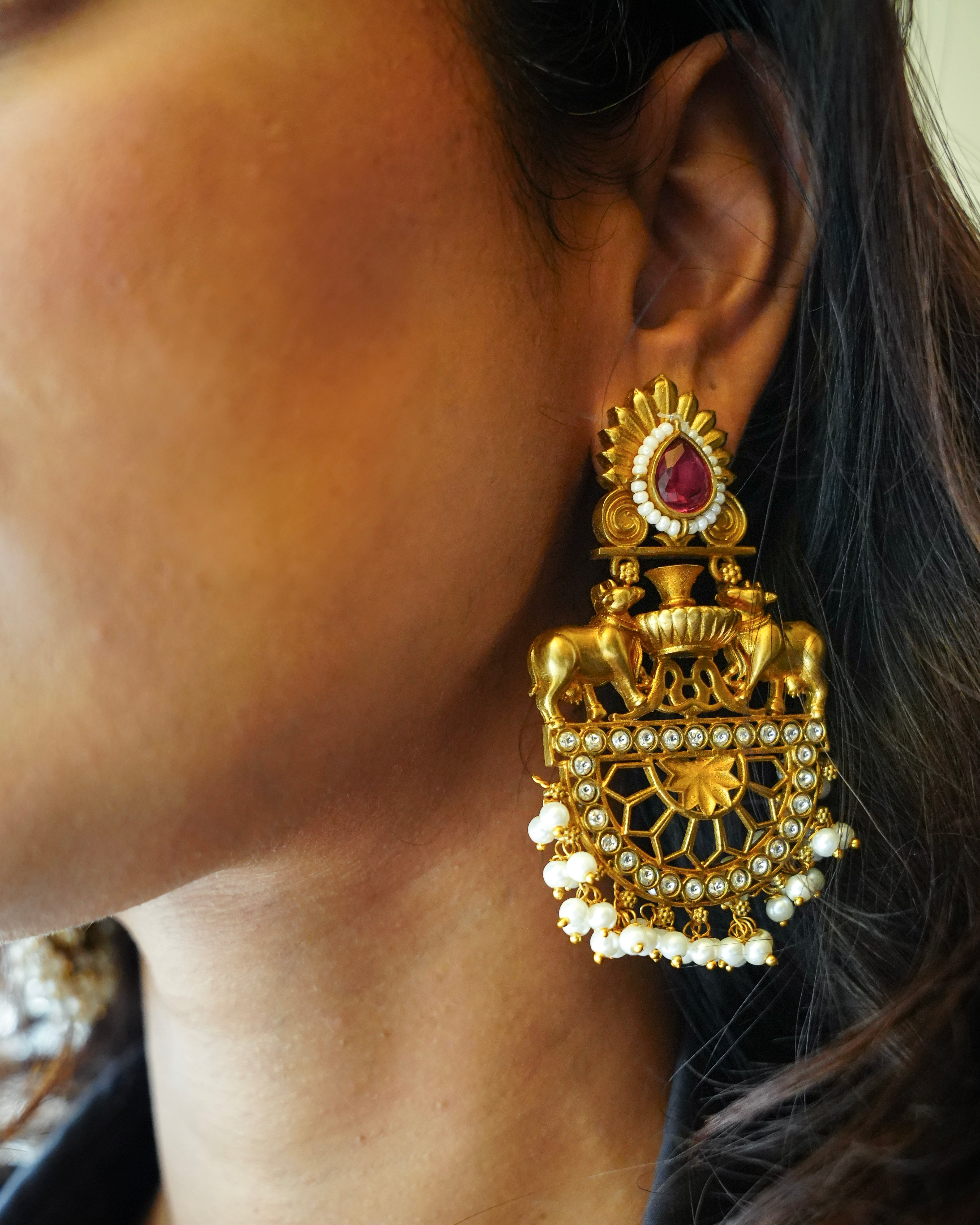 inspired by classic South Indian temple jewellery — complete with miniature motifs, warm gold tones, and a regal sense of presence. Set with a striking ruby-toned stone at the top and finished with layers of tiny pearls, these earrings are an ode to Indian craftsmanship at its most intricate- Pair these with a silk sari or brocade blouse for festive days, or contrast them with a minimal kurta and pulled-back hair for a modern vintage look.