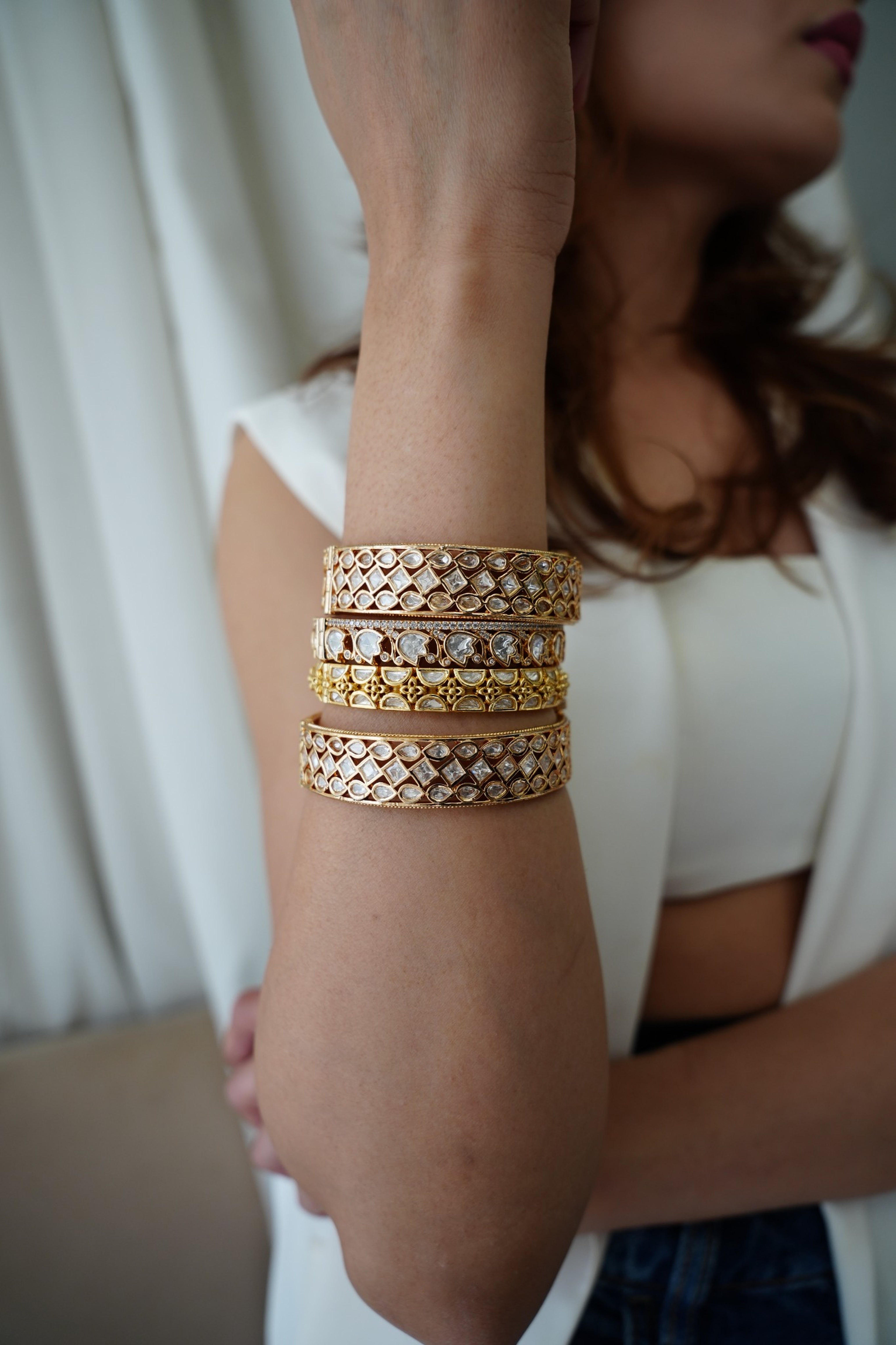 Rooted in geometric heritage and adorned with soft half-moon kundan-style stones, the Asmat Kadaa Set brings structure with softness. let it shine on its own with a solid-color saree or high-neck blouse to spotlight its detail-forward design.