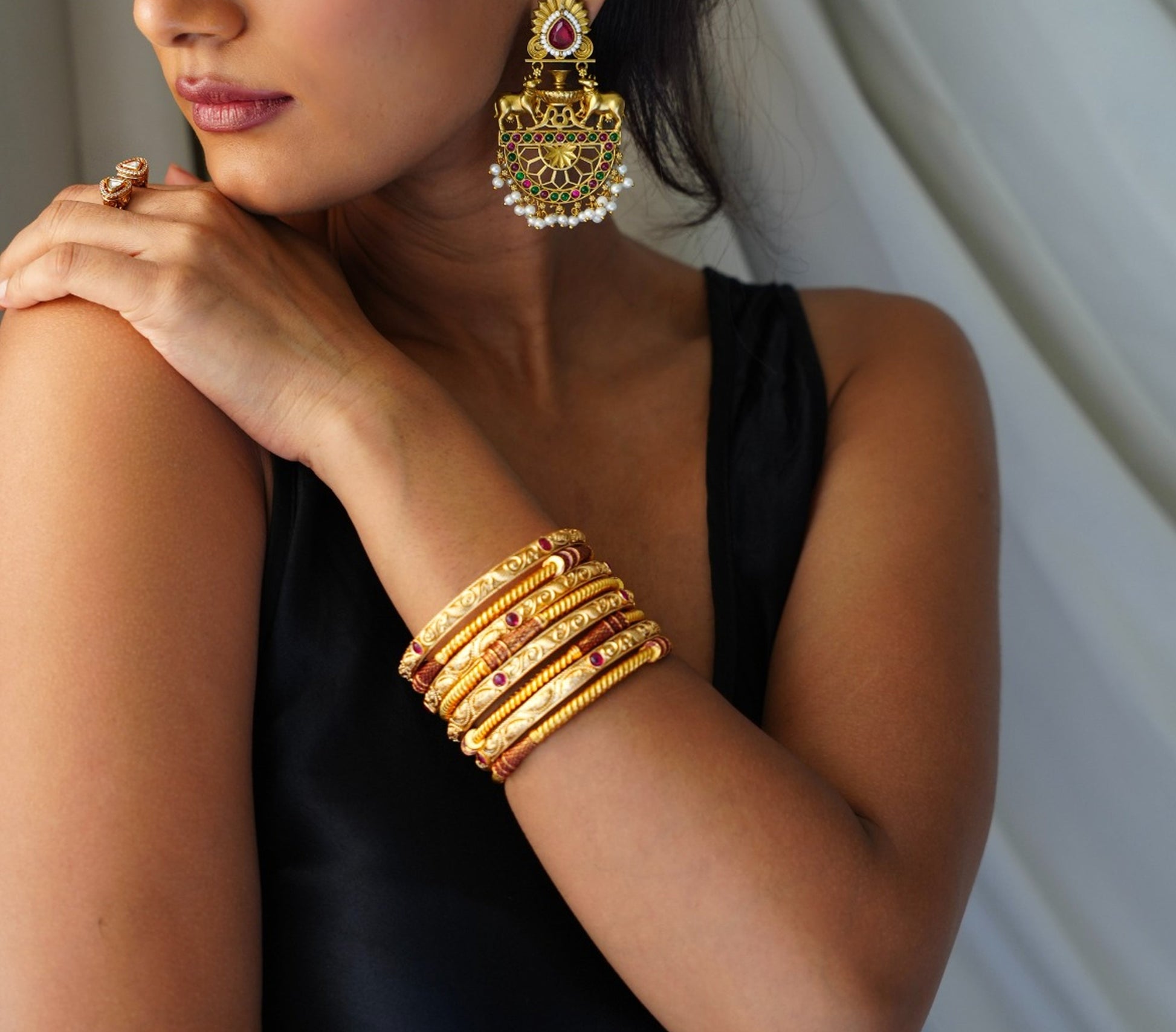 Intricately twisted gold textures meet rich maroon enamel work in these statement bangles. Stack them with our Kalyani Bangles for a layered, opulent look