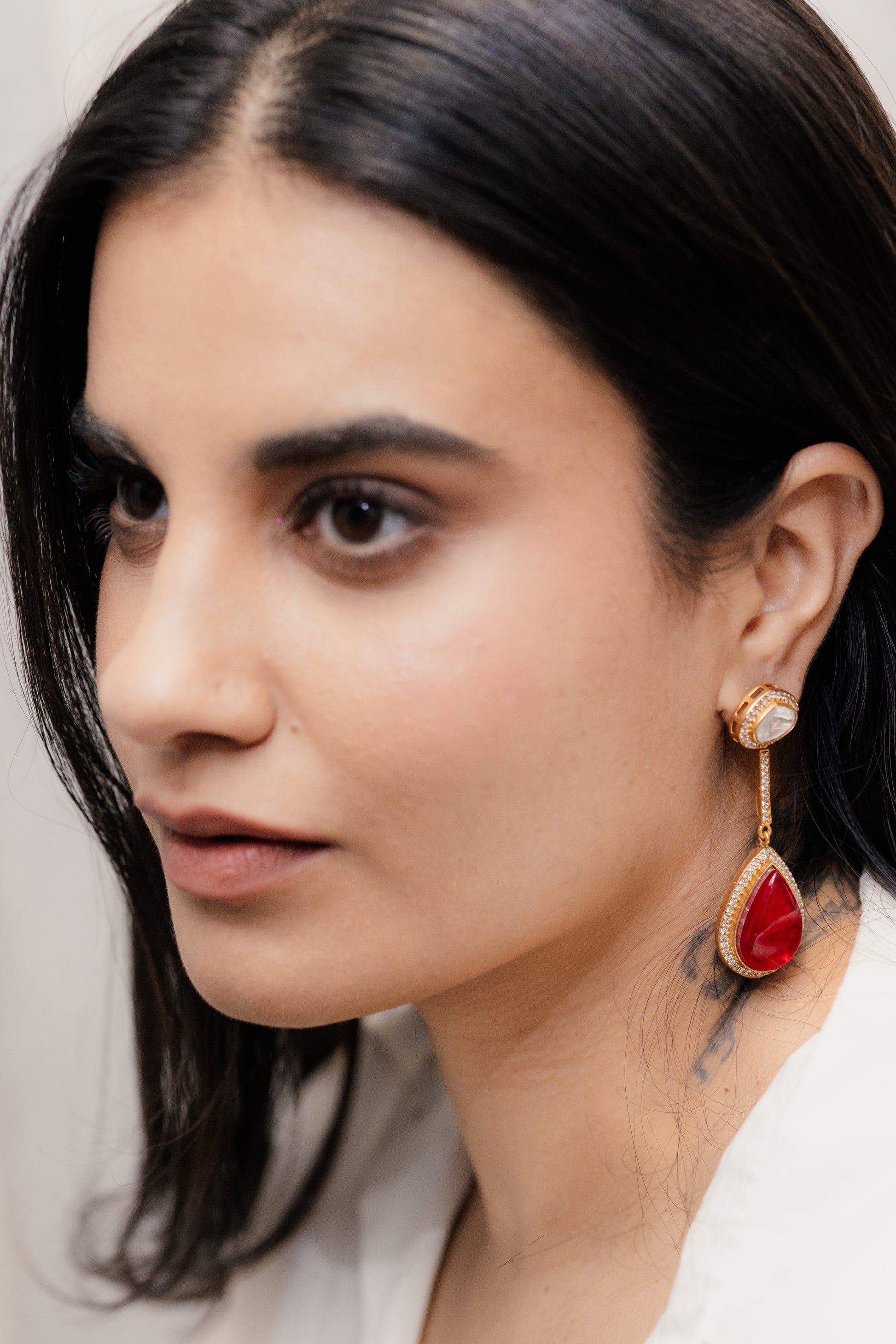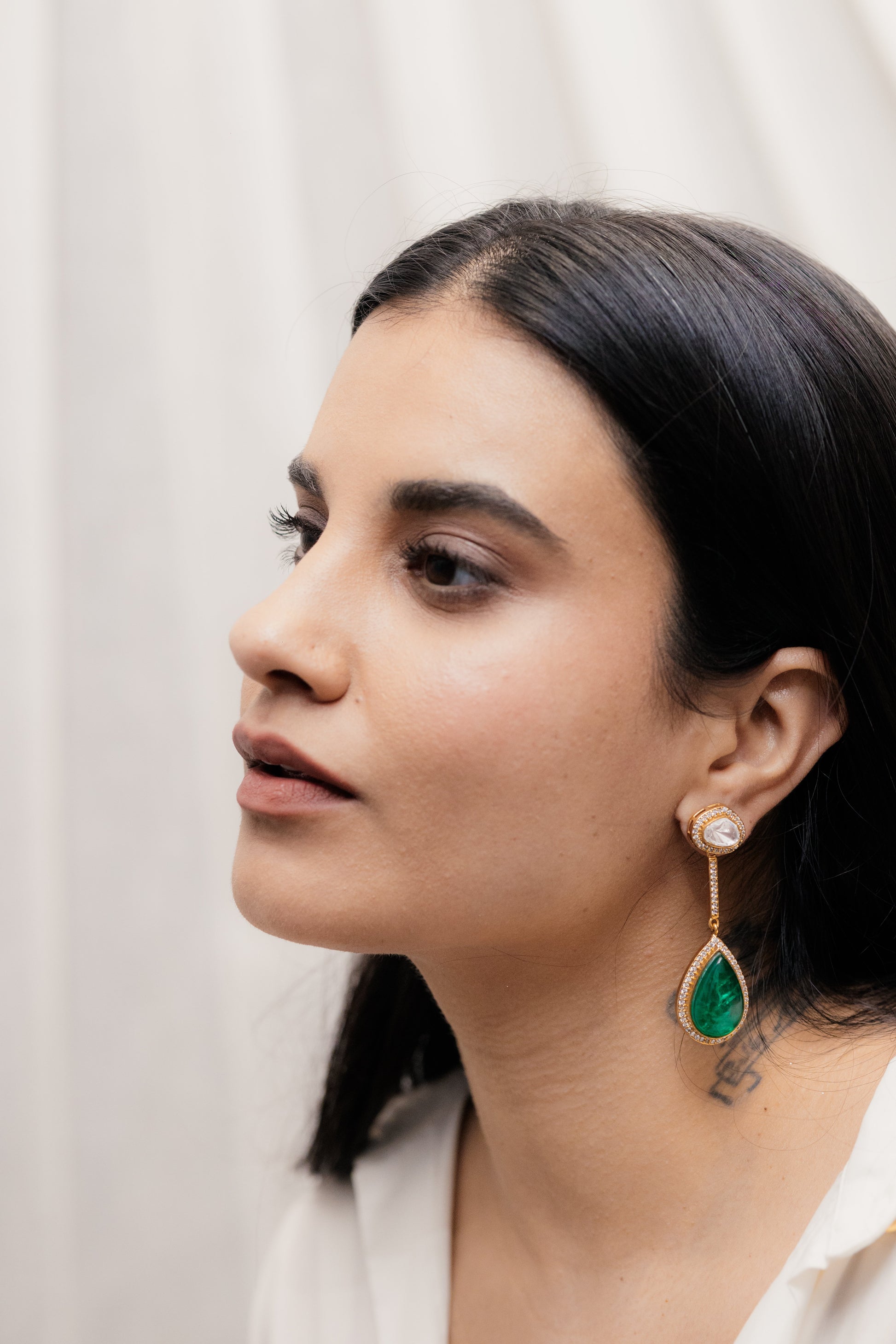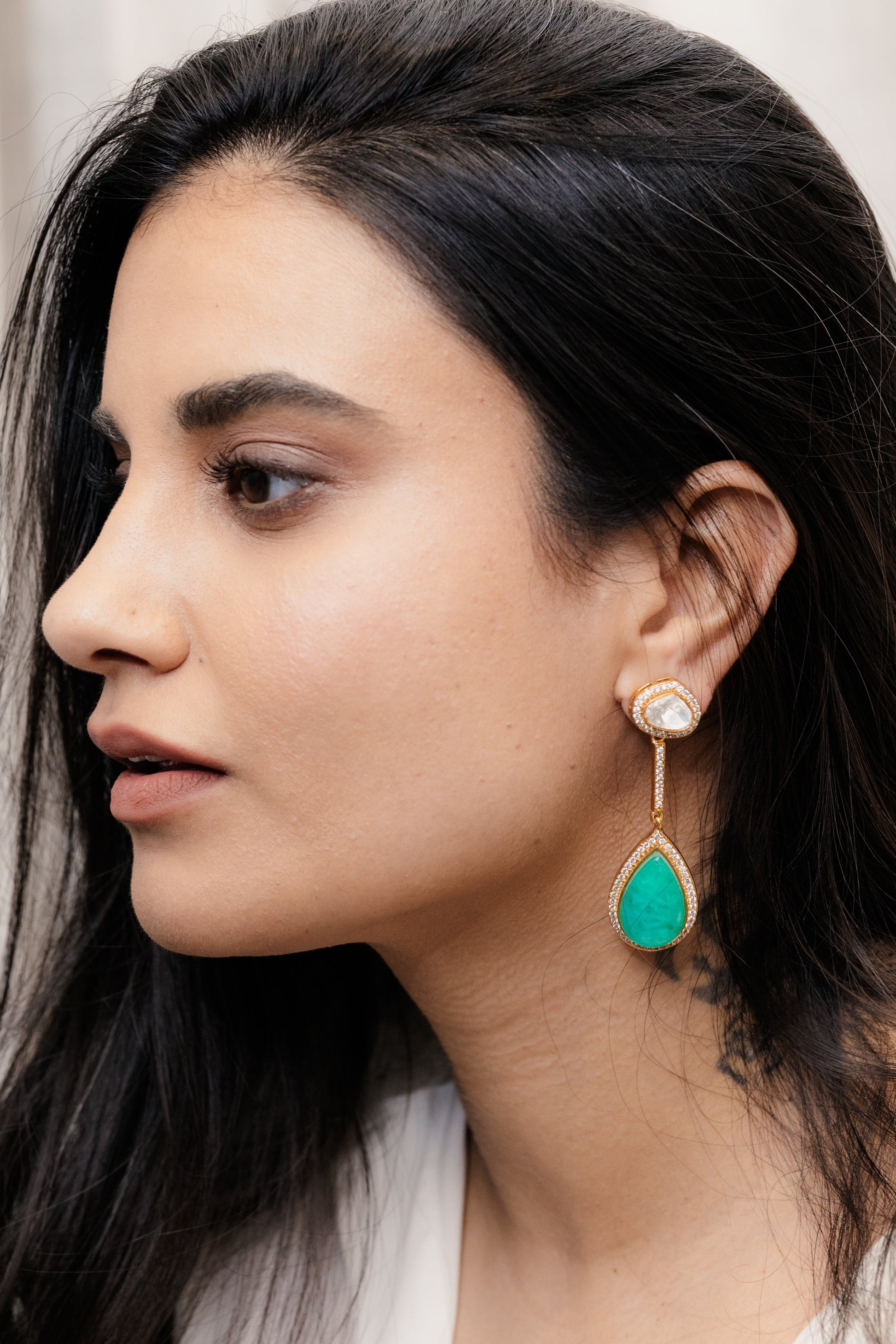 Polki danglers with drop shape stone, available in Turquoise, Ruby & Emerald