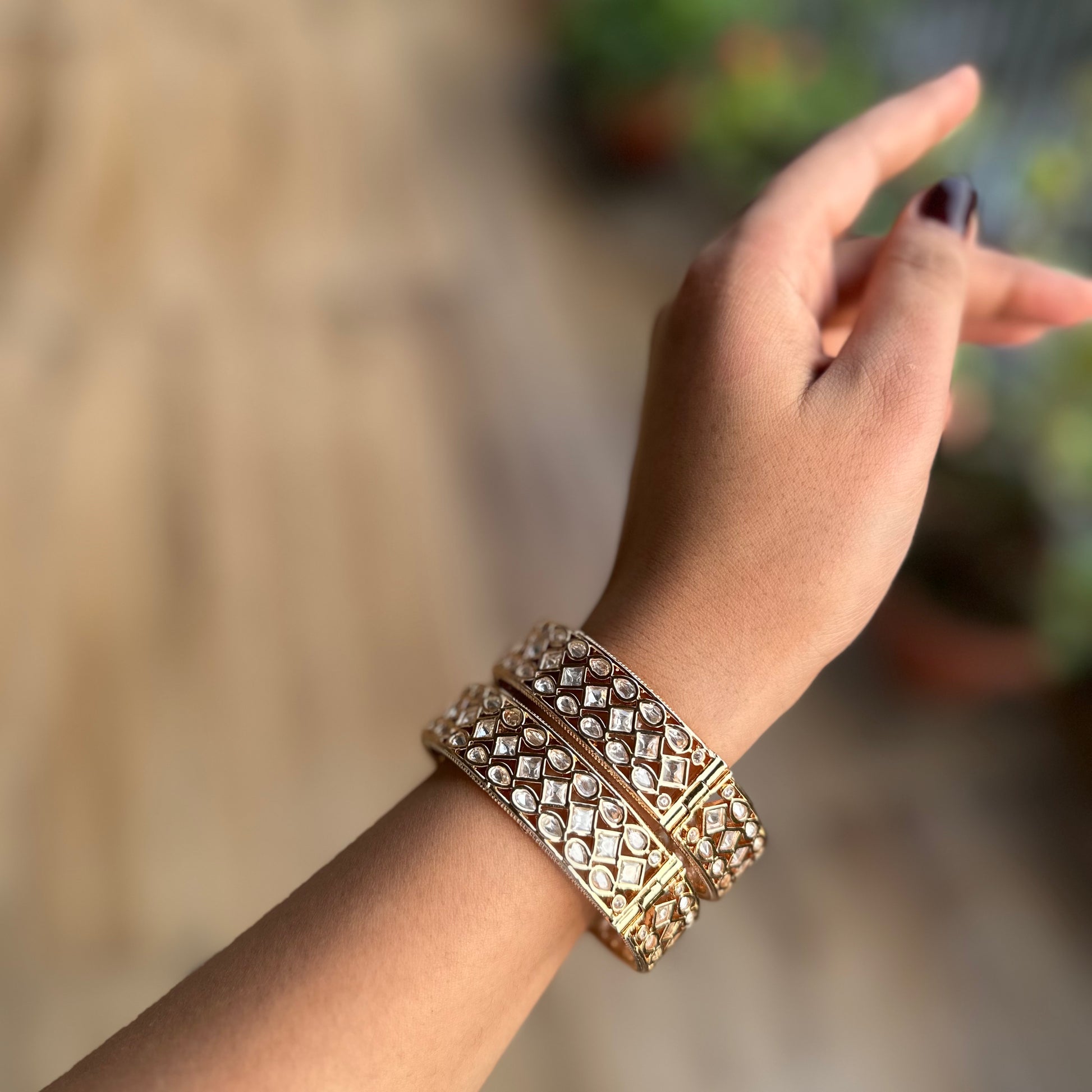 An elevated classic, the Bibi Kada Set features a symmetrical lattice of kundan-style uncut stones set against warm antique gold.