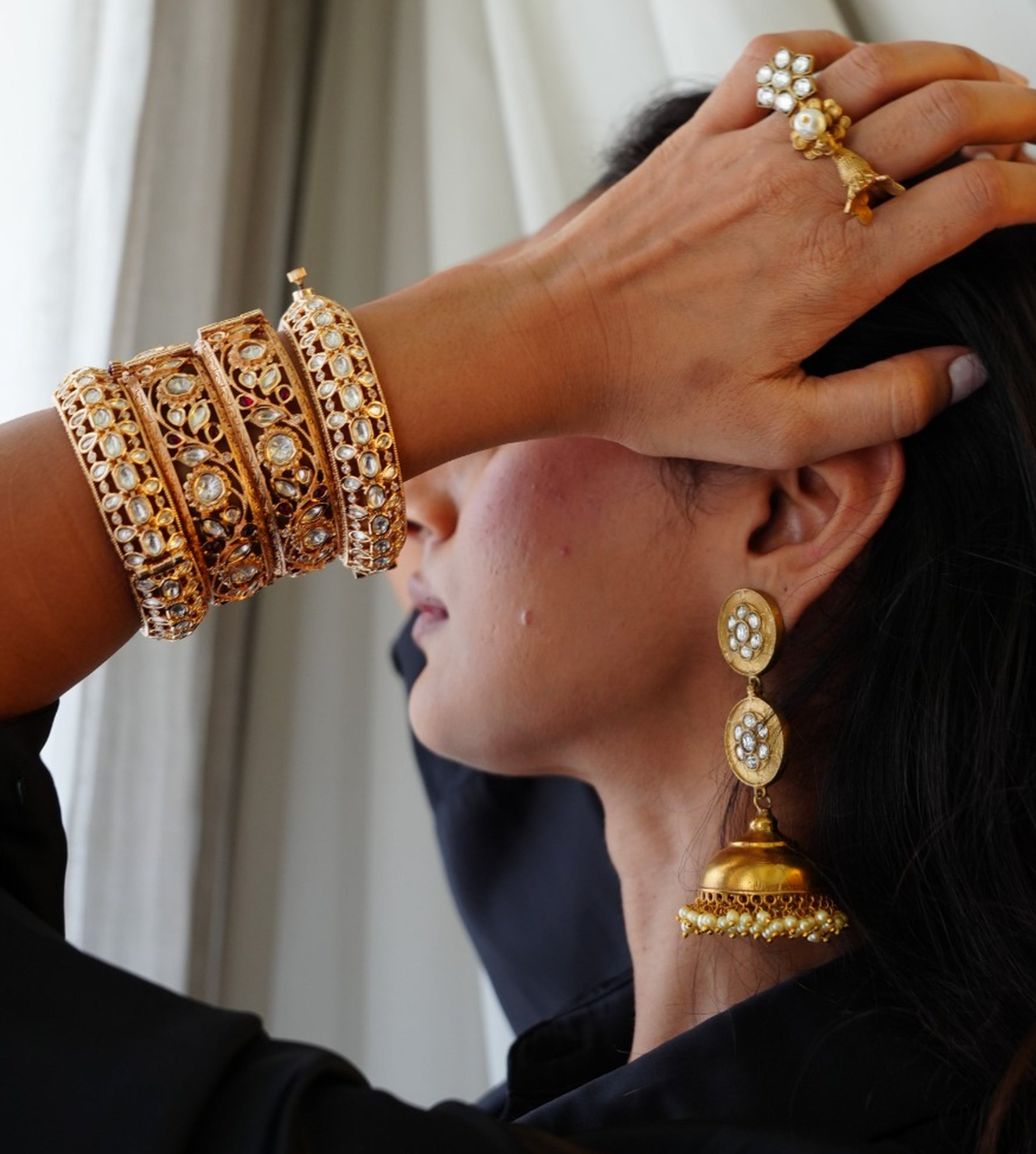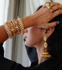 The Dilras Kadaa Set is where royal elegance meets intricate finesse. Featuring a meticulous layout of oval, marquise, and teardrop-cut kundan-style stones, these bangles bring in a soft shimmer with a high-impact finish. The delicate border detailing frames the design like miniature Mughal arches—rich, timeless, and graceful. A statement piece to be just worn together in one hand & go shine!