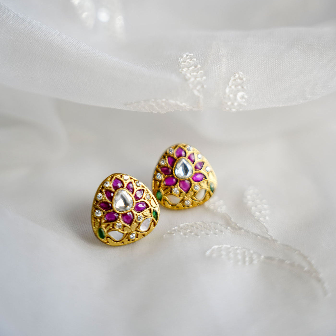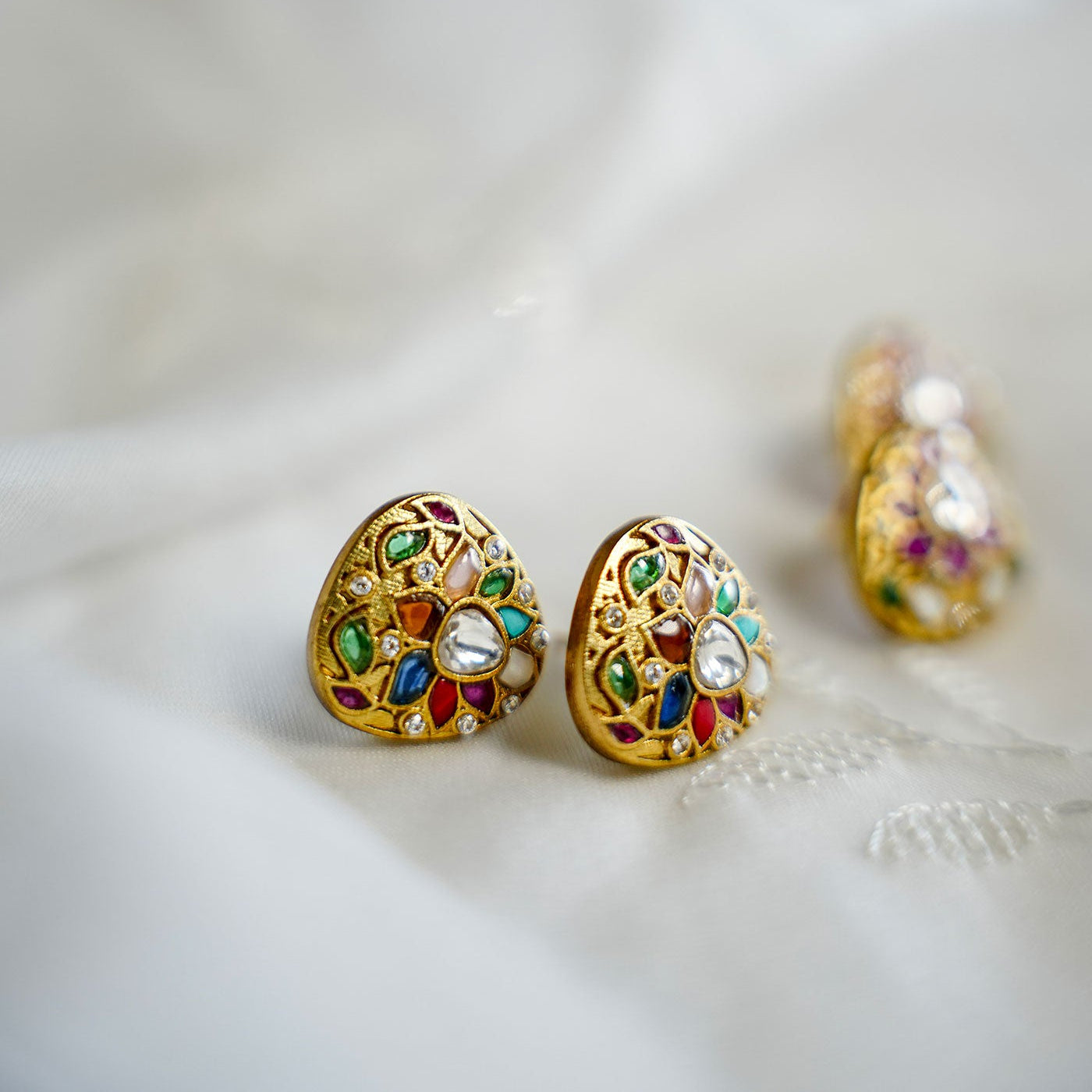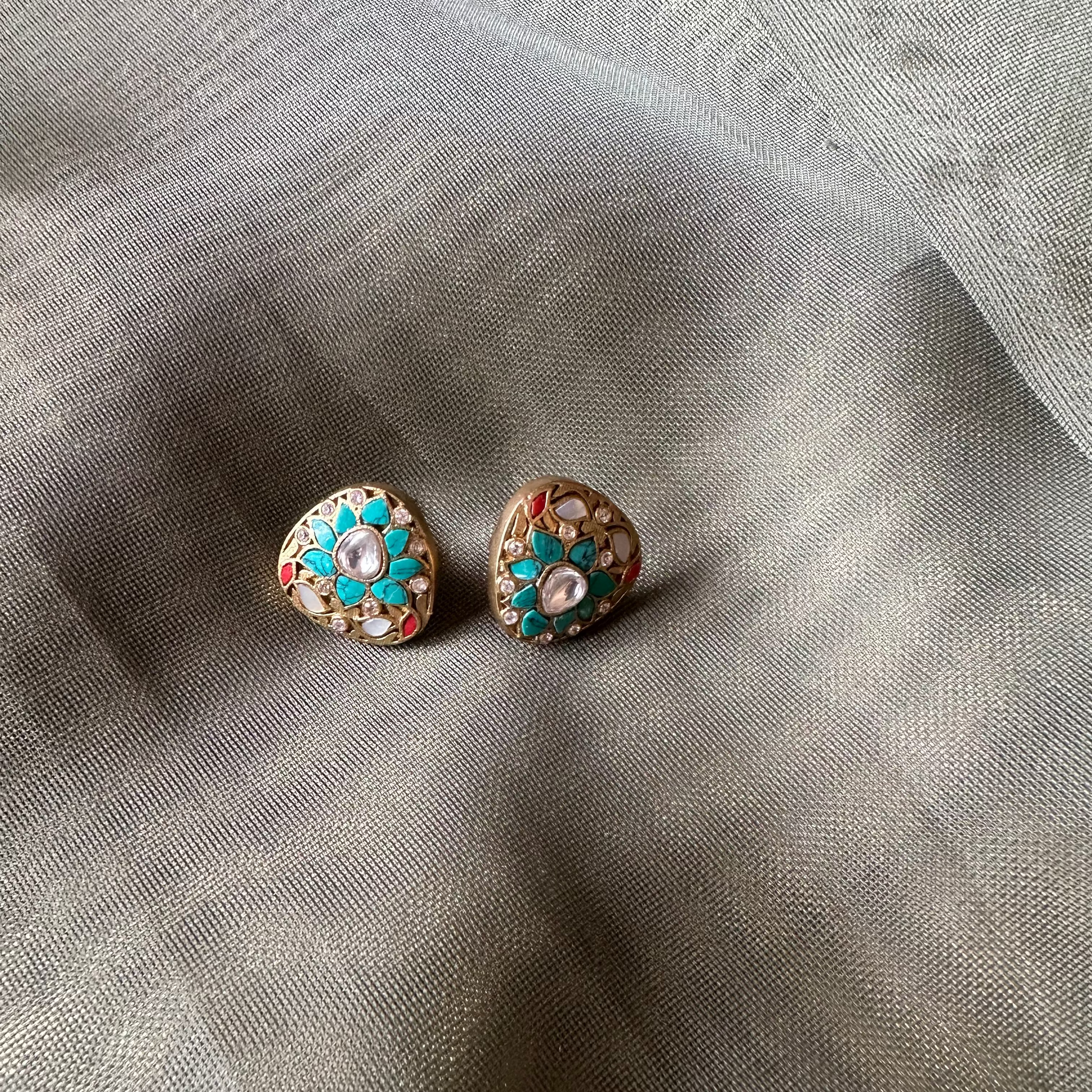 Petite in size but rich in detail, the Tara Studs feature a triangular floral burst of multicoloured kundan stones set against an antique gold base. With pops of ruby, emerald, sapphire, and topaz tones, these studs are like wearable little celebrations — easy to dress up, yet effortless for everyday colour plaY - Pair them with a messy bun, bindi, and a fresh cotton kurta — or wear them casually with denims and a white shirt for a colourful twist.