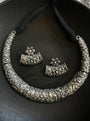 This embossed choker is crafted in oxidised silver-tone alloy with full-bodied floral detailing running across its curve. The matching half-moon shaped earrings are delicate but impactful — balanced with tiny hand-soldered blooms and a gentle matte finish.