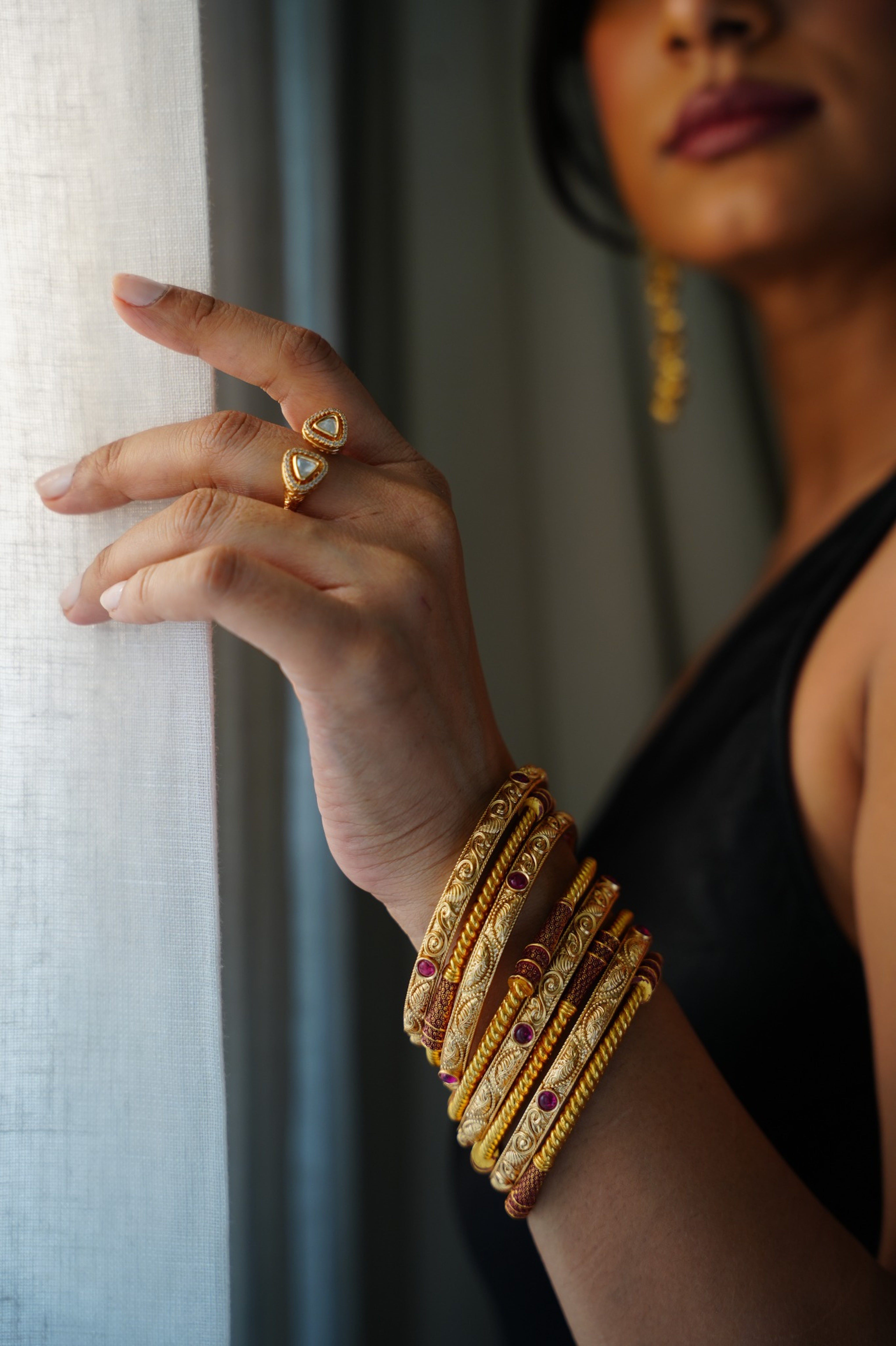 Inspired by South Indian temple motifs, the Kalyani Bangles are crafted with intricate hand-etched detailing and finished in a deep antique gold tone. Each bangle is accented with ruby-like cabochon stones, adding subtle pops of color against the ornate scrollwork.