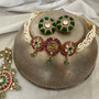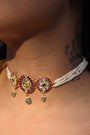 An elegant south inspired neckpiece that marries tradition with modern refinement. Set with delicate polki-style stones and finished with intricate detailing of pearls, this piece is designed to sit gracefully on the collarbone, adding a touch of quiet luxury to any outfit. Its timeless craftsmanship makes it perfect for festive celebrations, weddings, or as a statement addition to everyday classics.