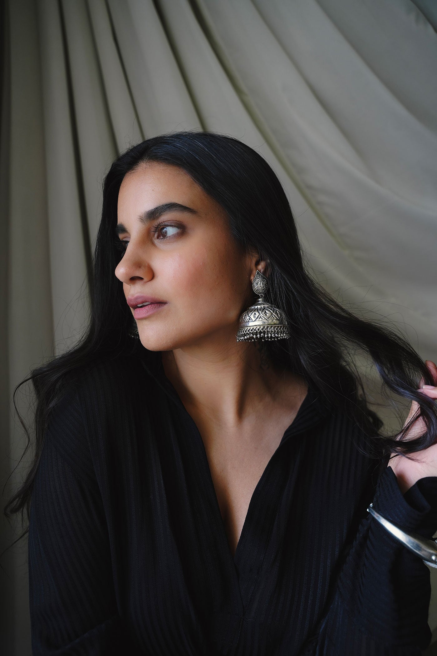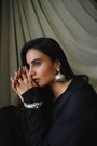 These jhumkas are bold yet familiar — like something borrowed from an old family trunk, but reimagined for today. Handcrafted in oxidised silver-tone metal with a tiered dome and intricate motifs, they carry weight both literally and stylistically - These earrings do all the talking — pair them with a swept-back bun, kohl eyes, and an easy black kurta or oversized shirt.
