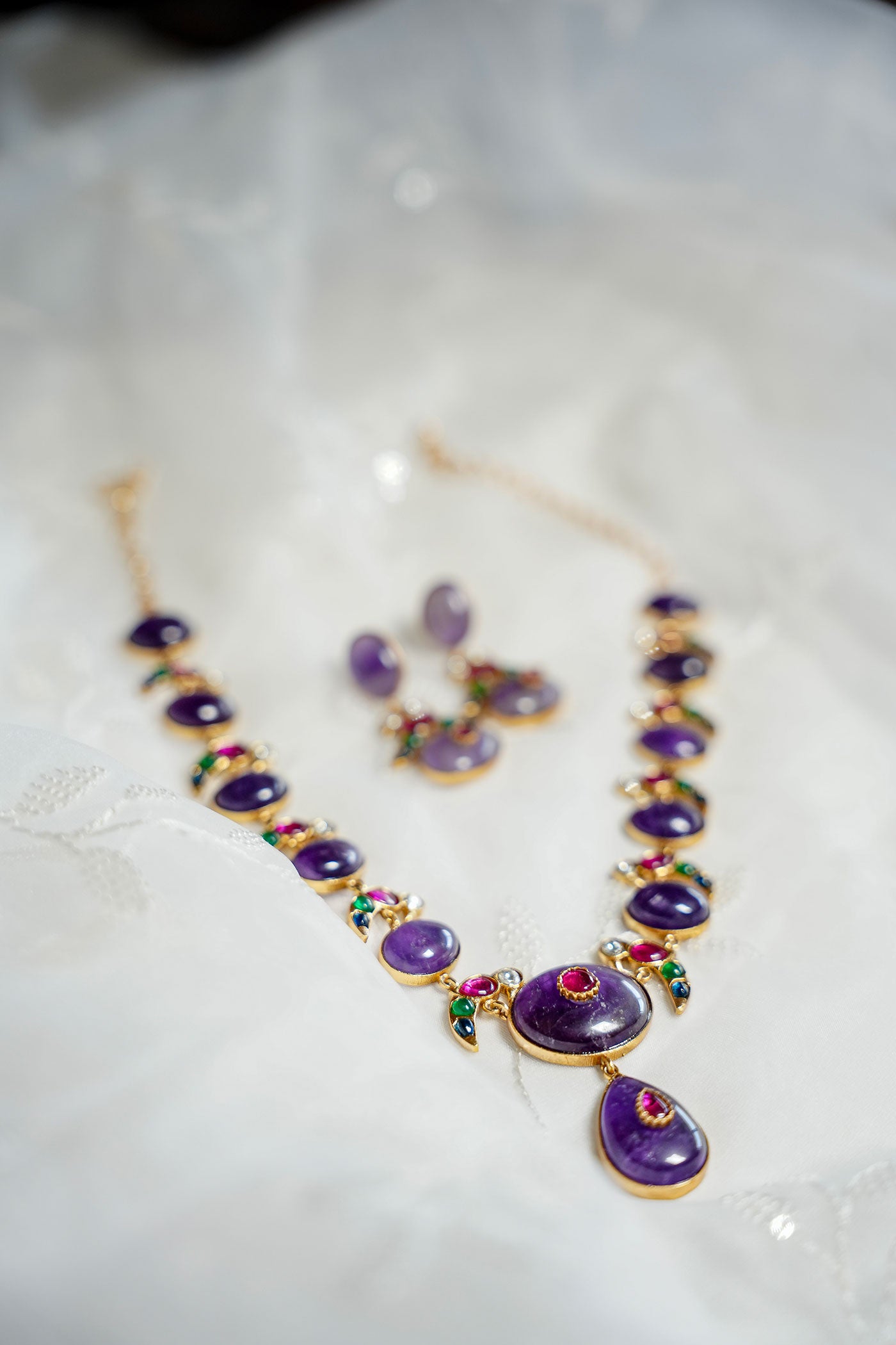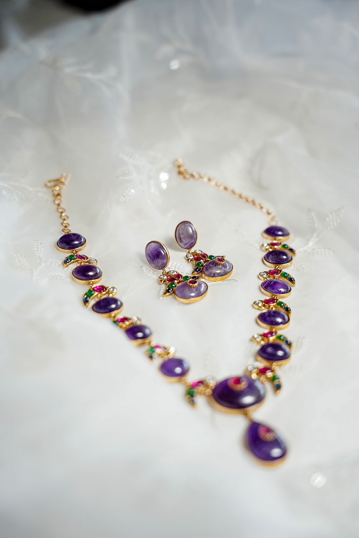 The Mahira Set brings together the richness of amethyst tones with delicate detailing in gold, green, and ruby accents. Each circular purple enamel setting is bordered with tiny stone clusters and layered into a clean, flattering silhouette for that queenly vibe, straight out of a mahal in rajasthan - a flowy blouse and palazzo combo for a modern-meets-traditional vibe. Ideal for festive lunches, mehendi events, or styled with soft waves and dewy makeup for a romantic evening look.