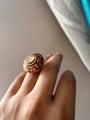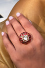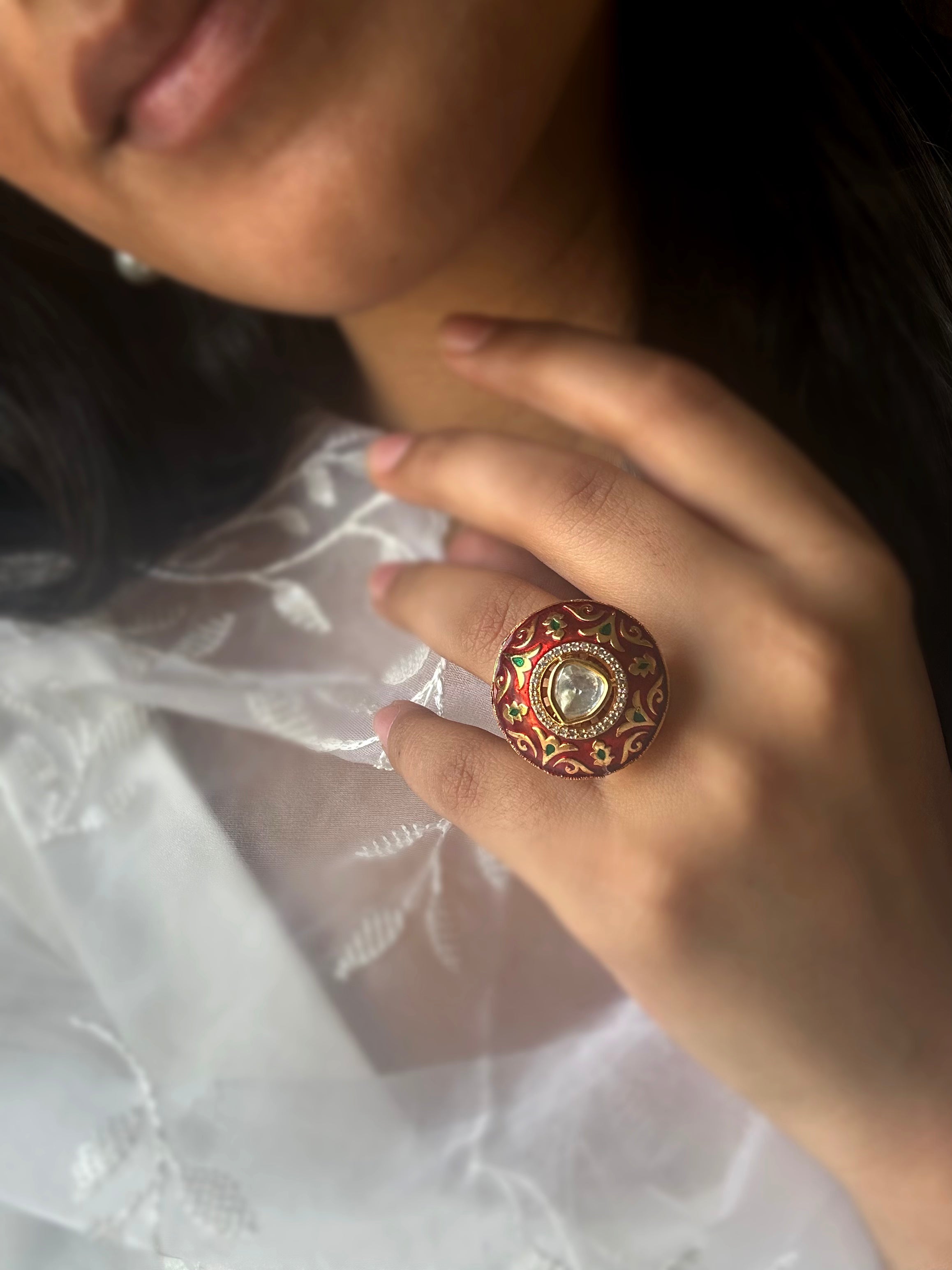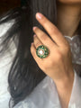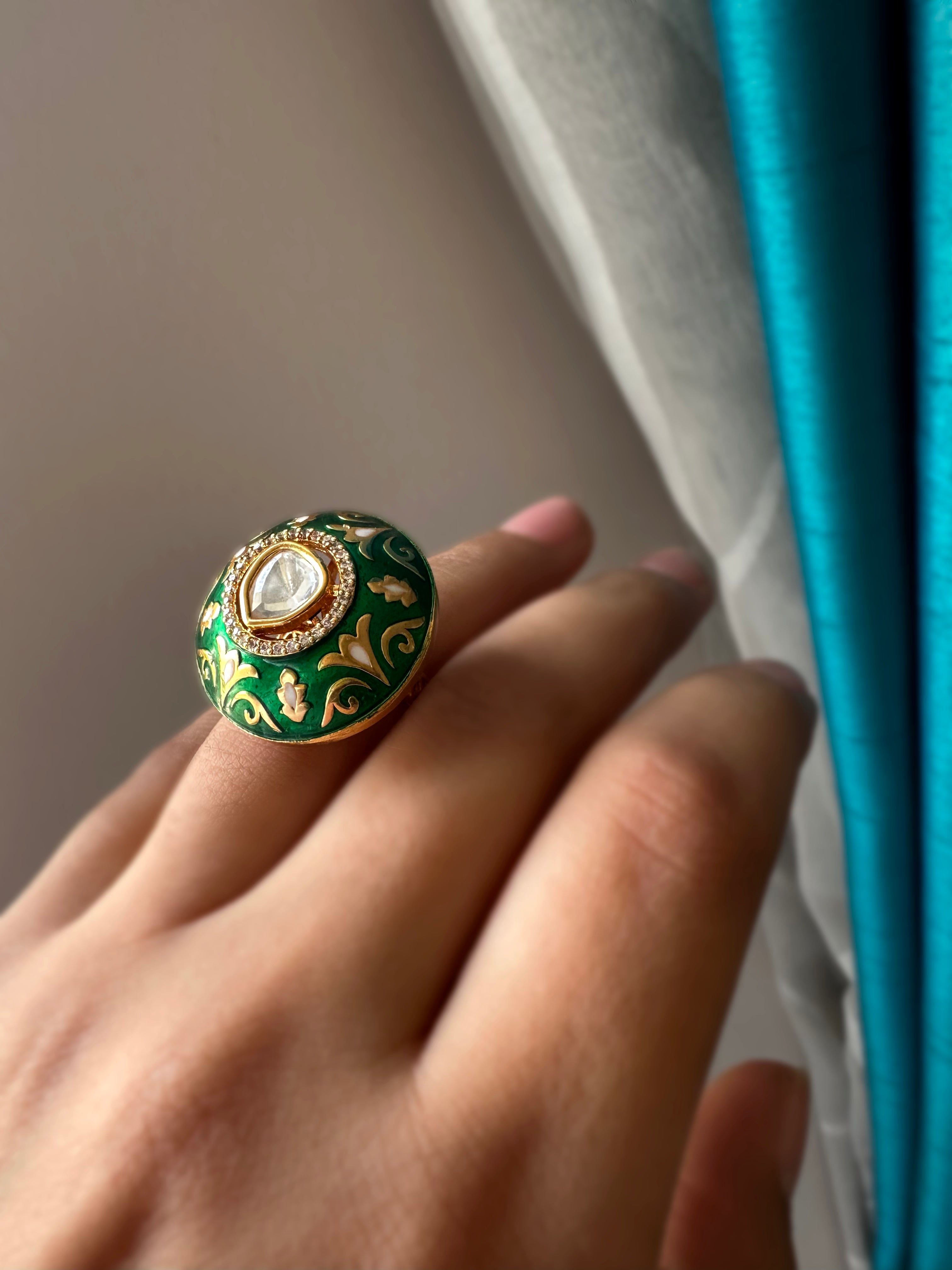 Handdone intricate meenkari work on Emerald & Ruby colored ring with a polki stud.