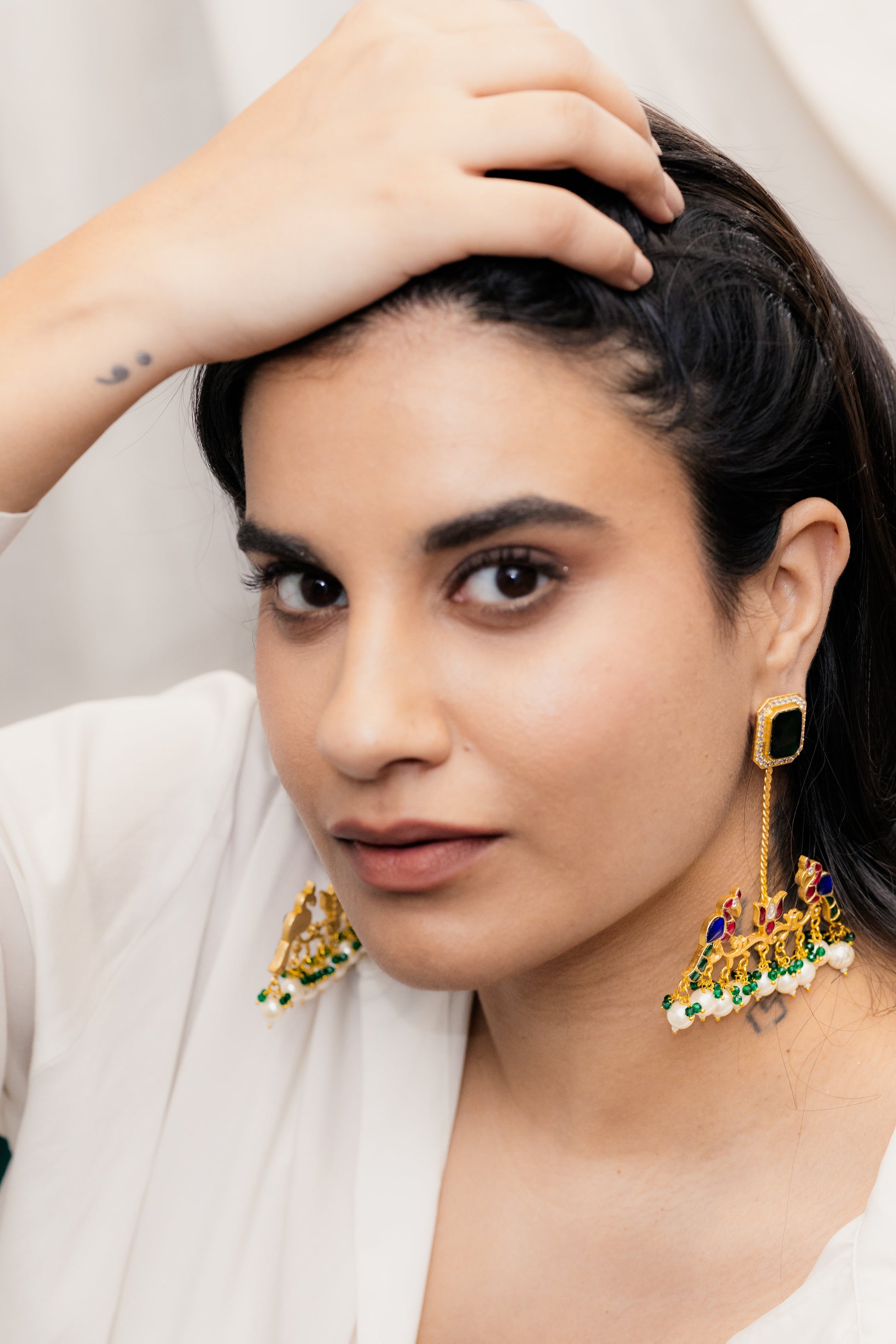 Emerald stone & diamond danglers studded with meena kari work on gold plated base.