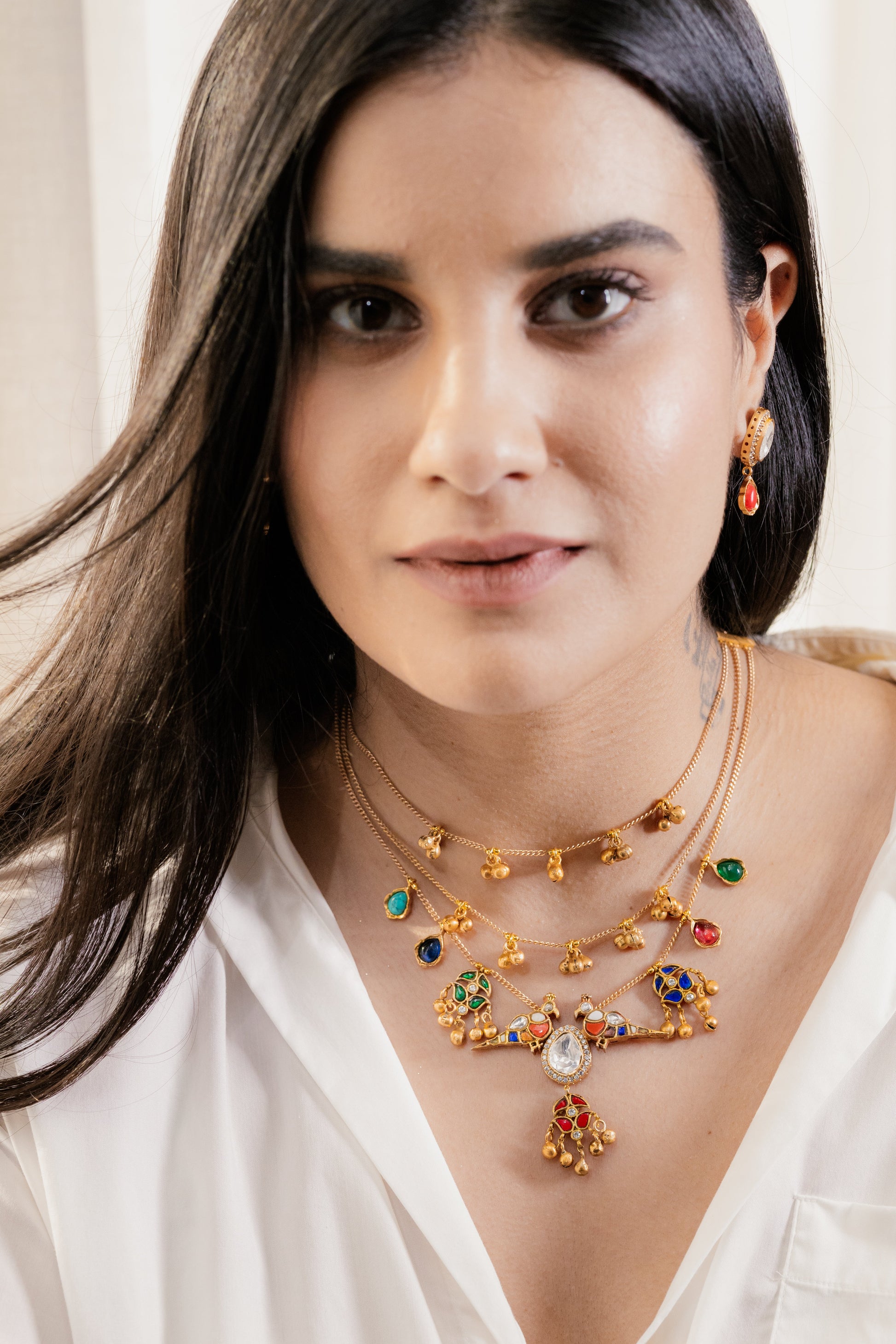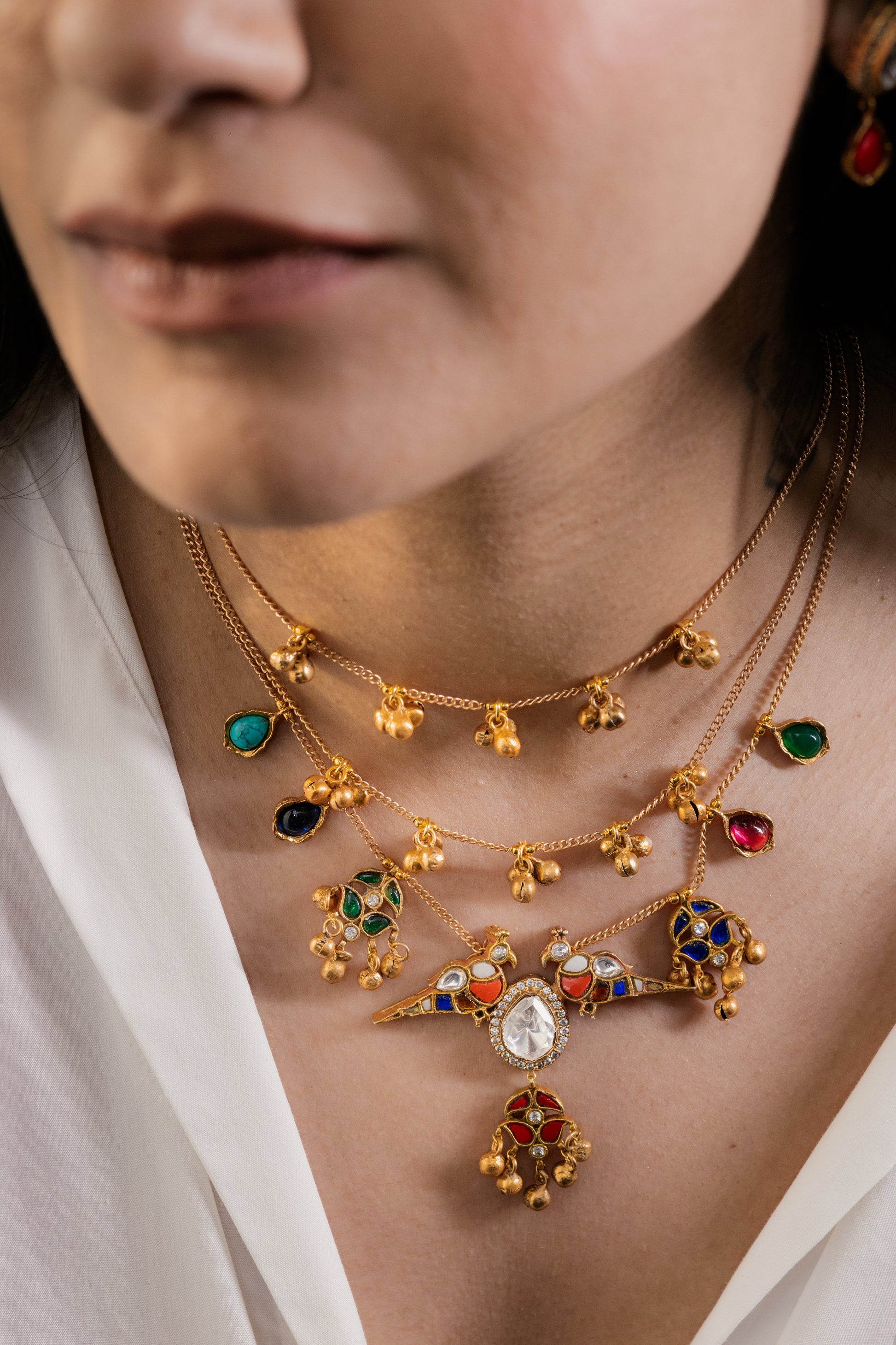 Three layered multicolored meenakri set, handmade with morifs & polki, goldplated on brass