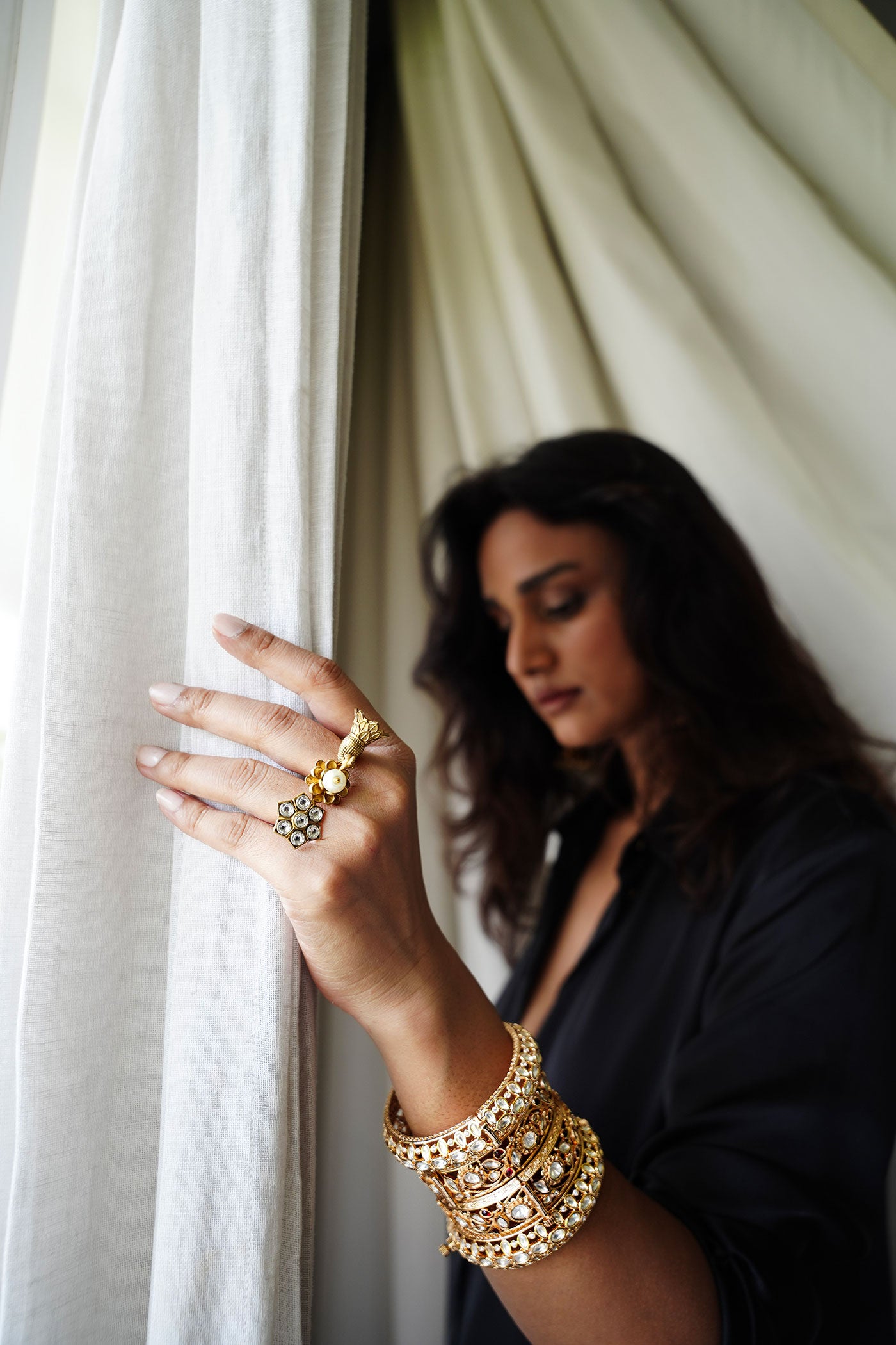 Designed to stretch across two fingers, this antique gold-tone piece features twin floral domes connected by a single vine-like spine - Let it steal the spotlight — skip the bracelets or pair it only with soft, stacked bangles.