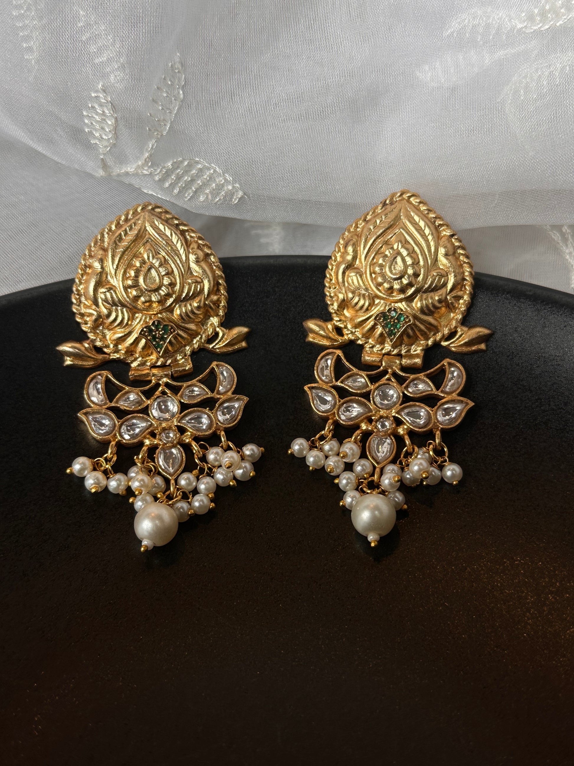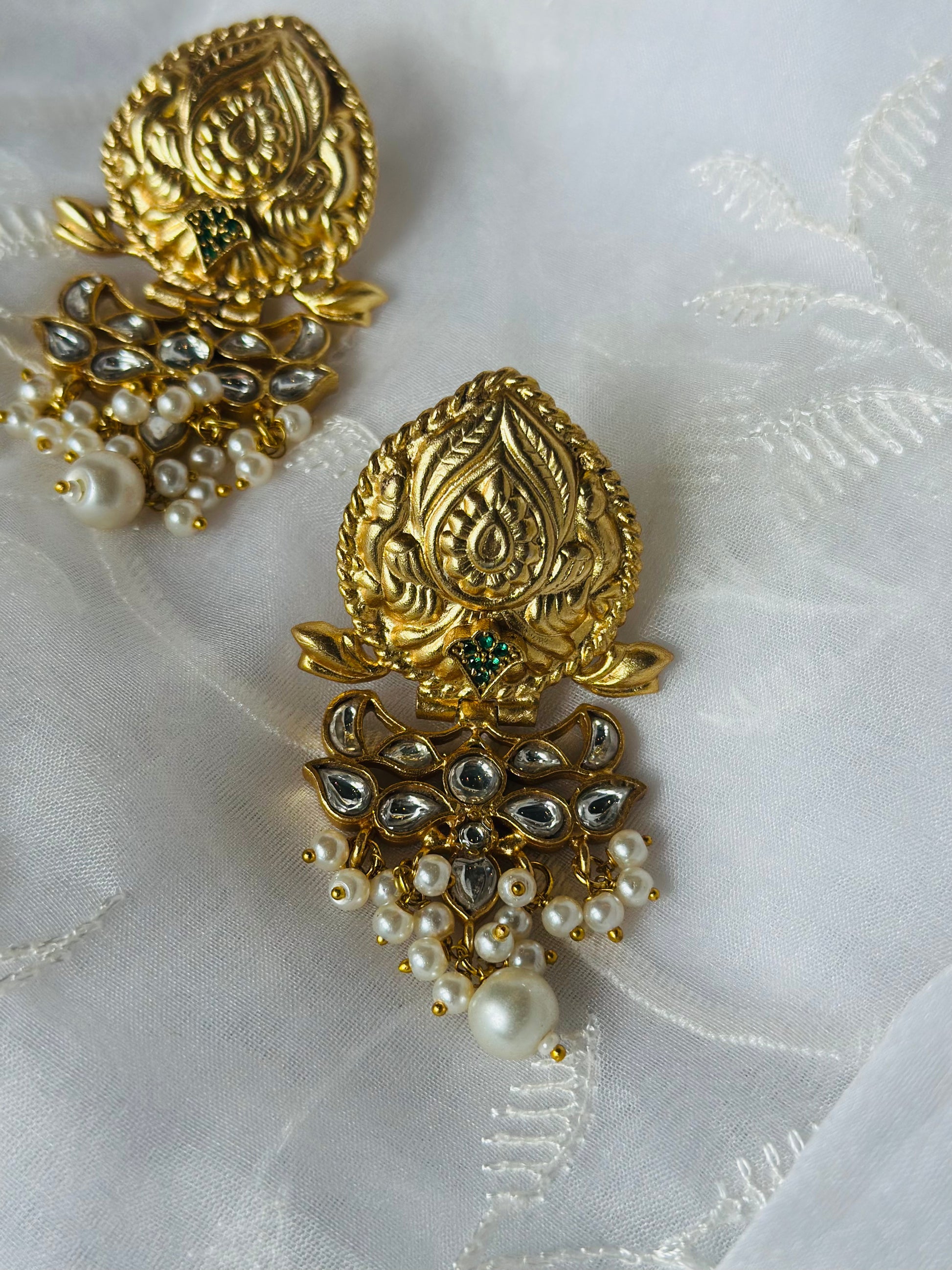 The Nandi Polki Danglers feature a detailed Nandi figure at the centre, Framed in a gold-tone arch and adorned with uncut-style polki stones, the earrings flow into elegant danglers with pearl and bead accents for a soft, ceremonial finish. Every detail is steeped in heritage, yet styled for the modern wearer.