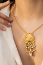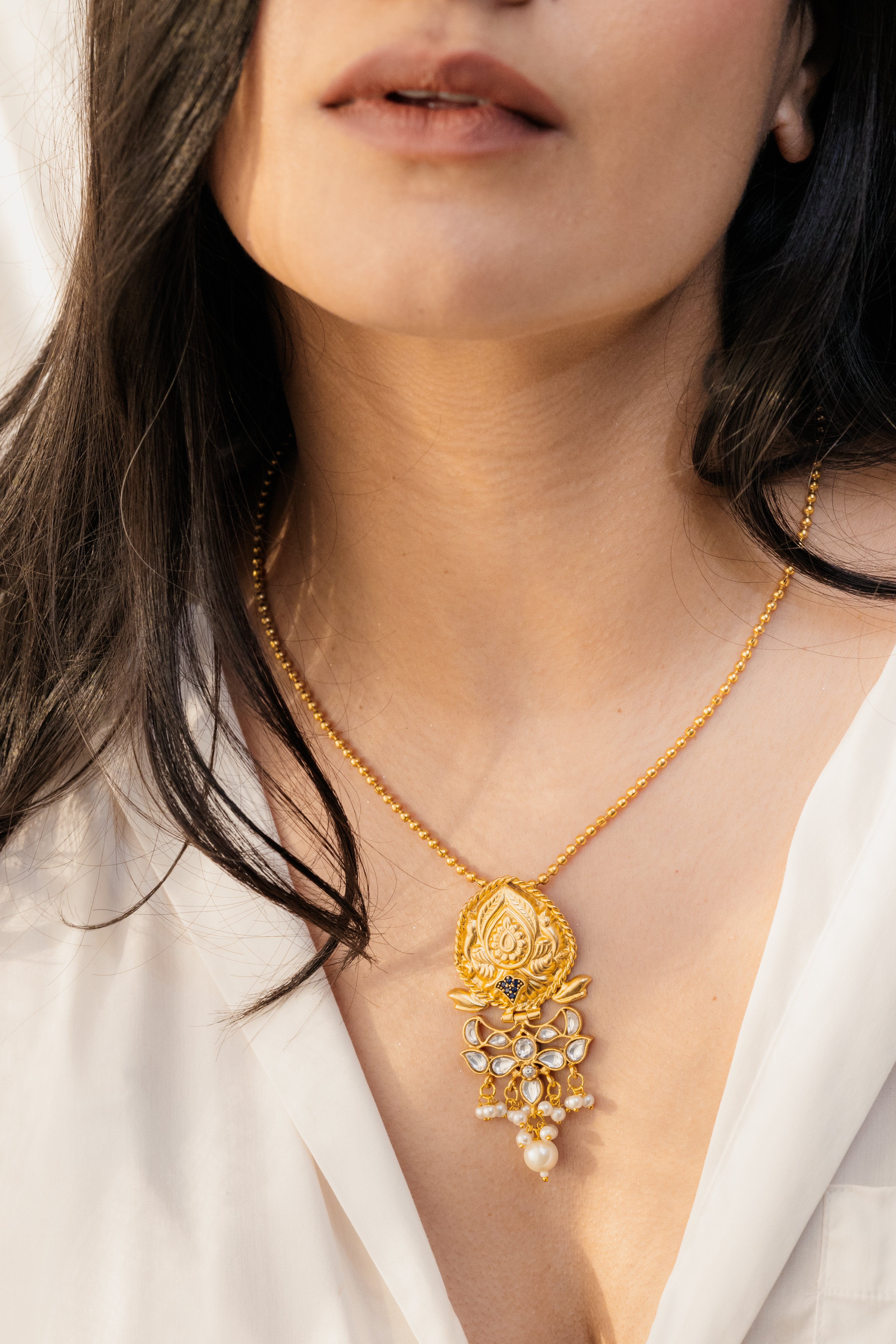 Gold plated embossed motif with polki & pearls on a neck string
