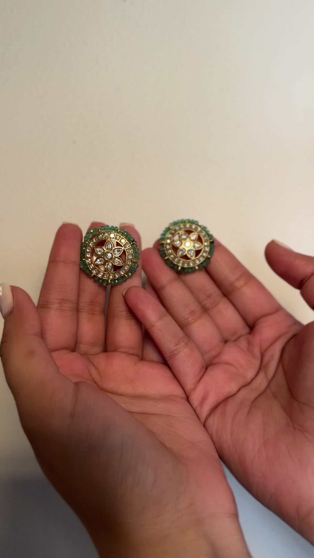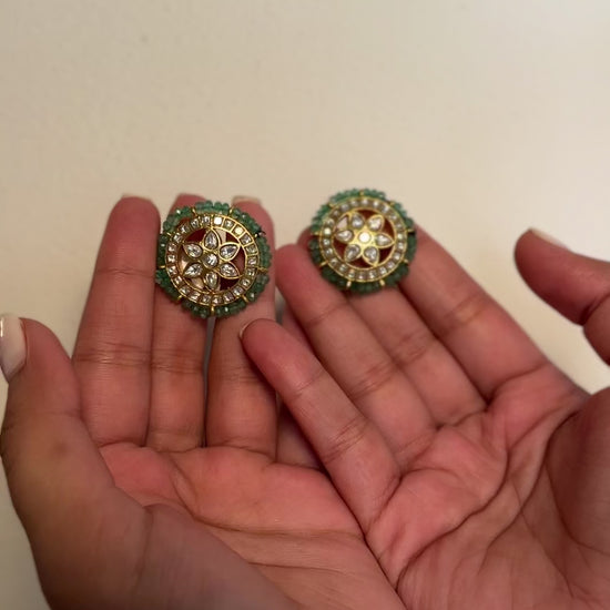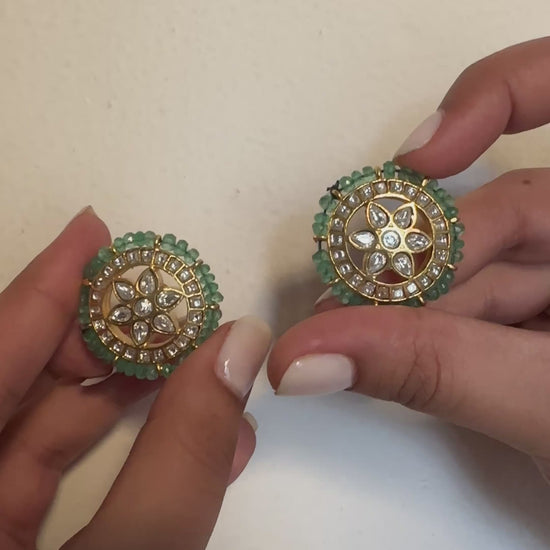 Like an art collectors sort after piece, Outlined with light emerald beads, intricate polki setting inside, a statement size of the stud to give it a statement look.