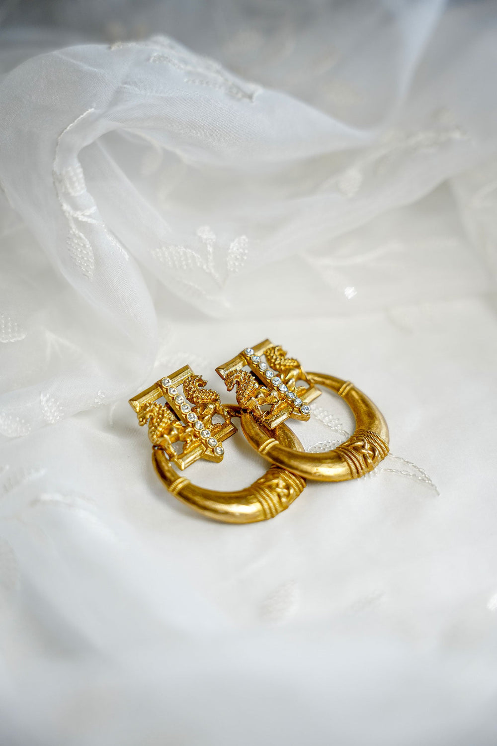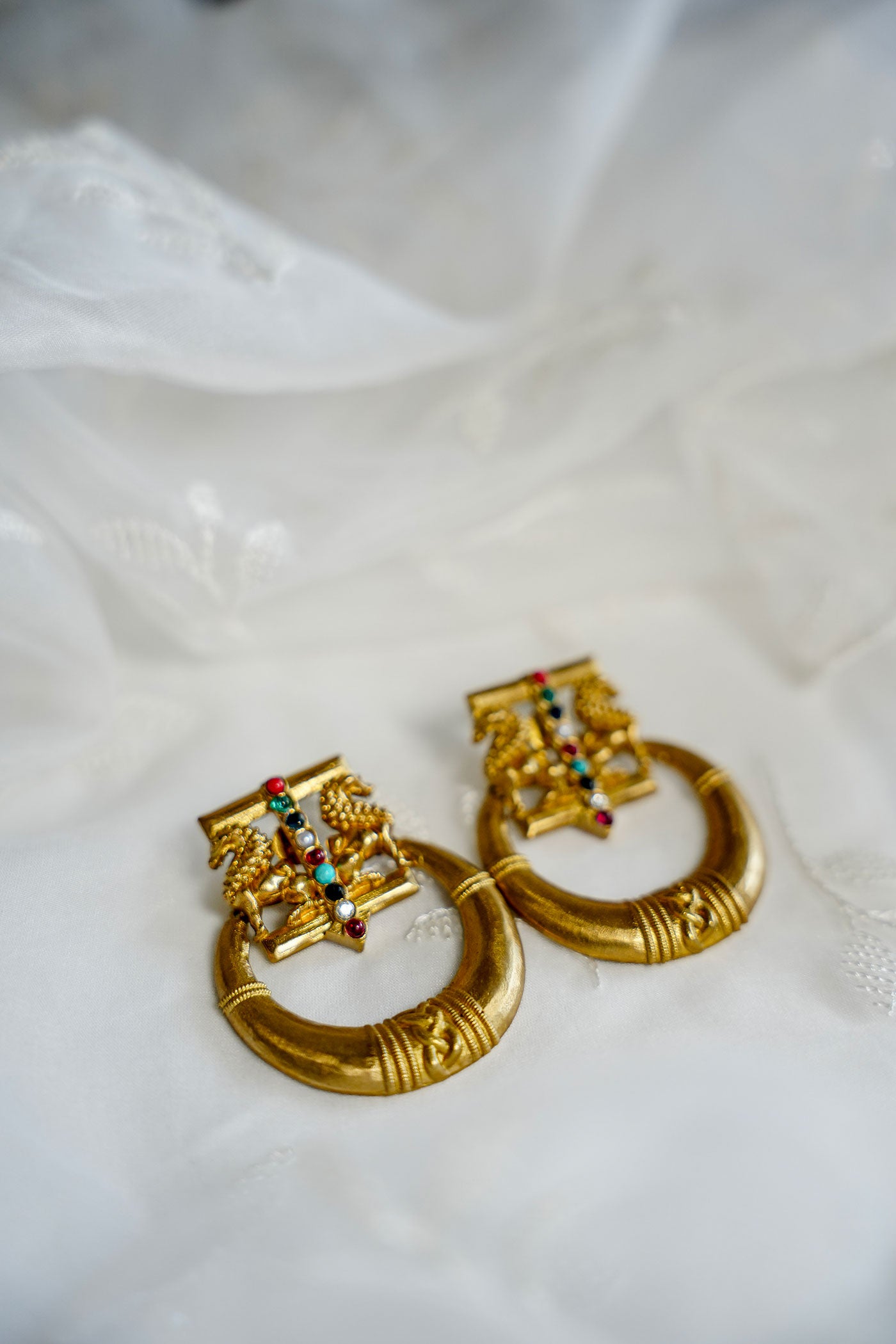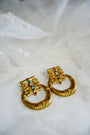 The Nira Earrings feature chunky gold-tone hoops anchored by a temple-style stud top, detailed with mini enamel pops in Polki, Ruby & Emerald. Handcrafted in a matte antique gold finish, these earrings feel like heirlooms from a parallel future — rooted in culture, reimagined in form-Let them frame your face with a slick bun, earthy tones, or a classic red bindi. These pair beautifully with linen sarees, angrakhas, or even an oversized shirt for an eclectic, styled-down look.
