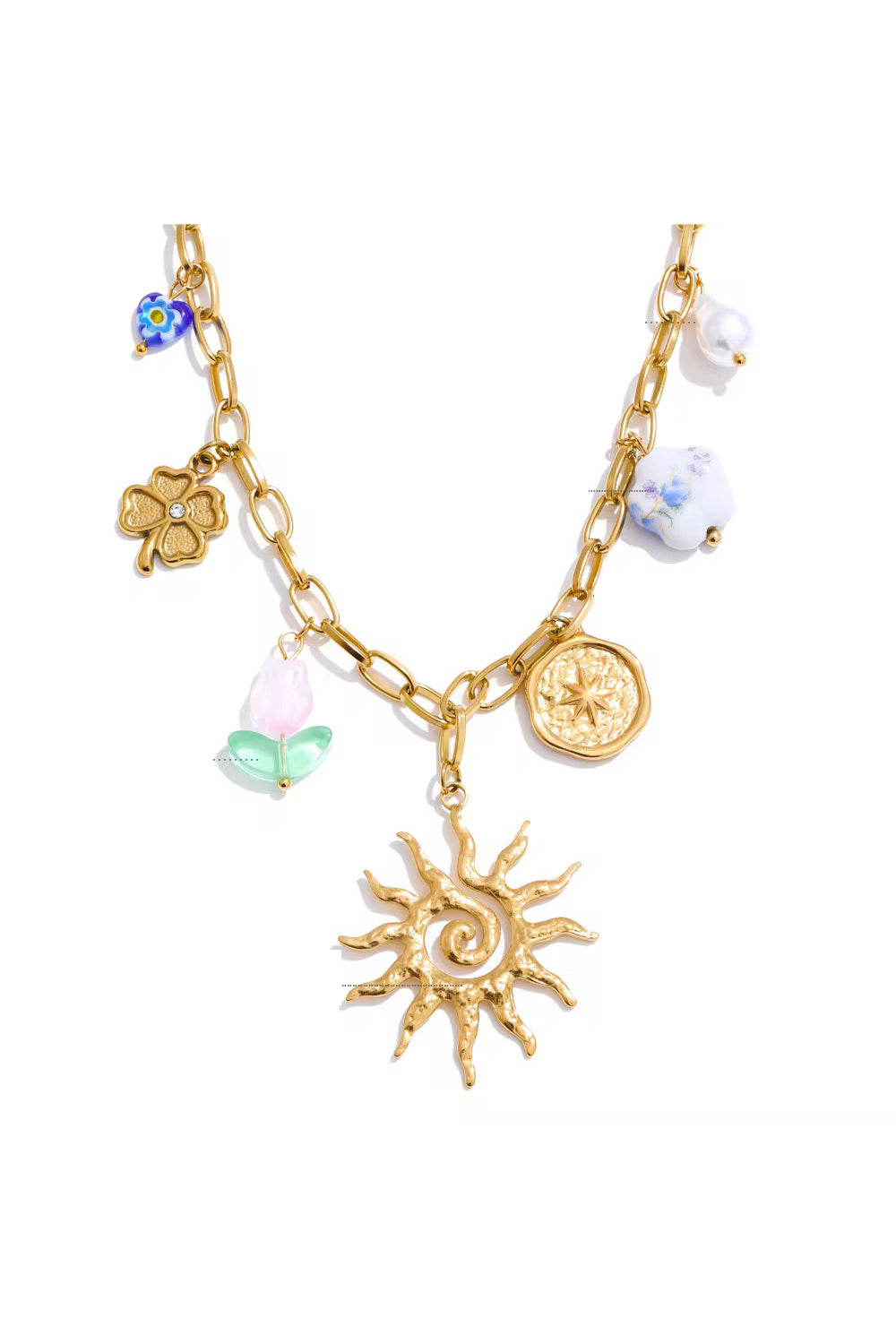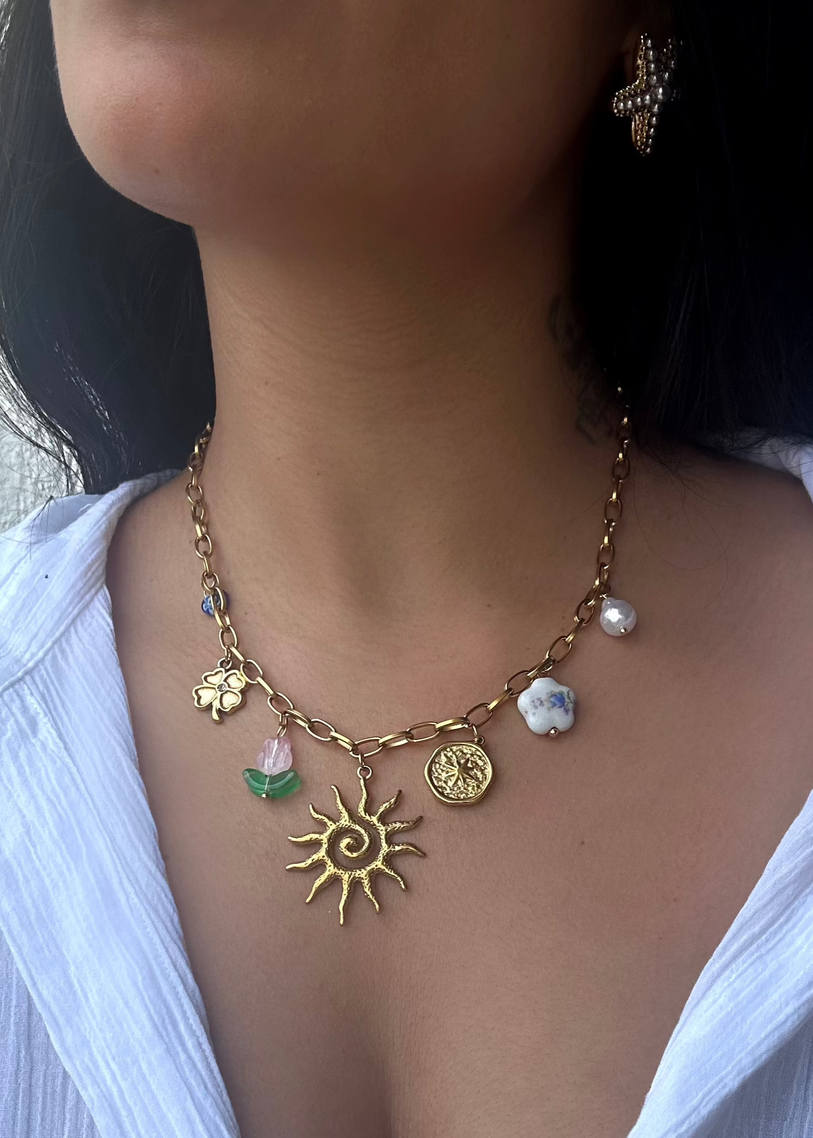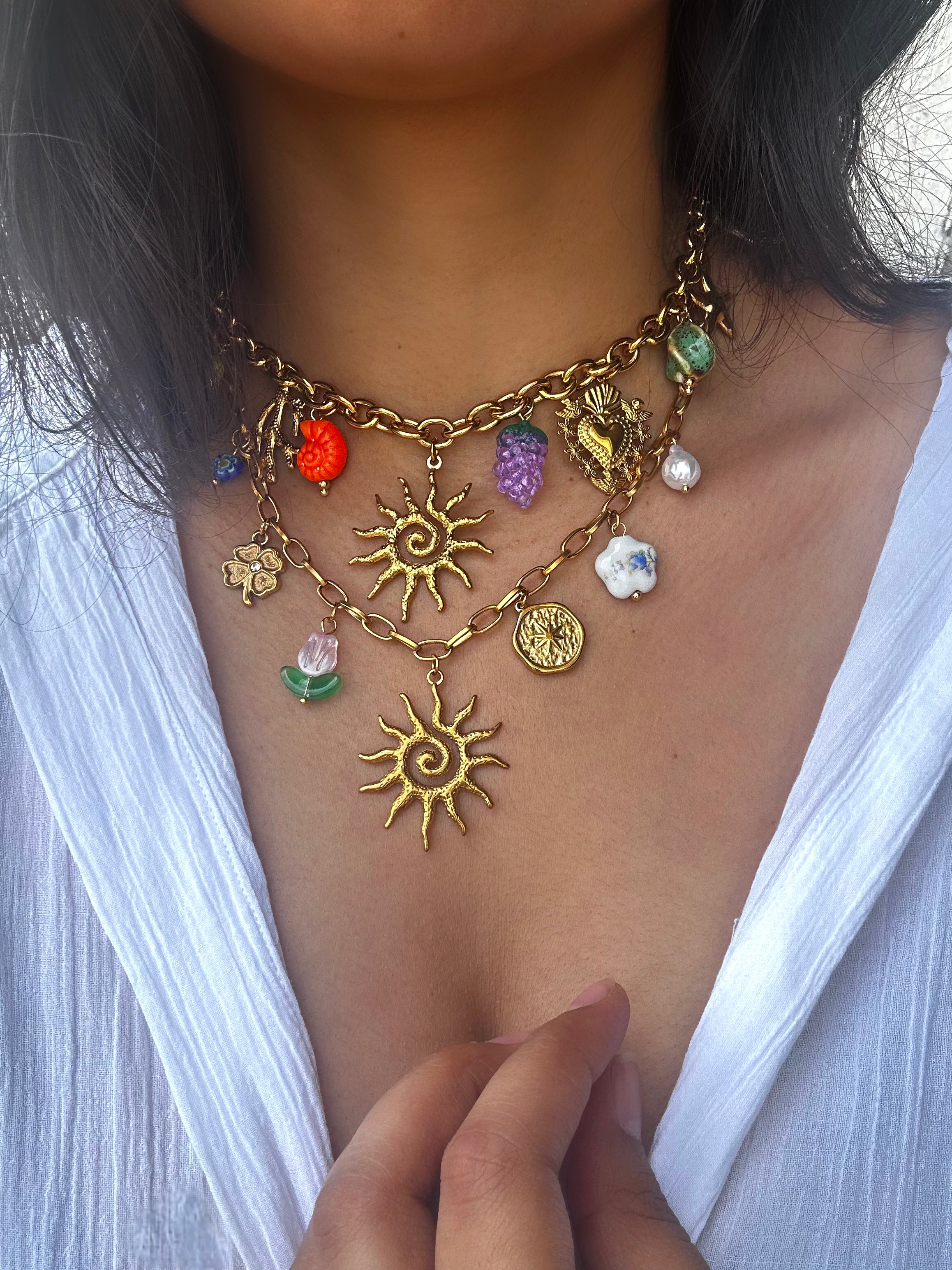A chunky gold necklace with different charms handing, Perfect for the holiday styling.