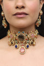 Bold, regal, and unapologetically statement-making — this royal choker set is crafted with intricate polki stone detailing and layered elements that create depth and grandeur. The rich blue stones paired with delicate accents bring a luxurious, heirloom-inspired feel, making it perfect for weddings and grand celebrations. Pair it with contrasting tones like ivory or gold.
