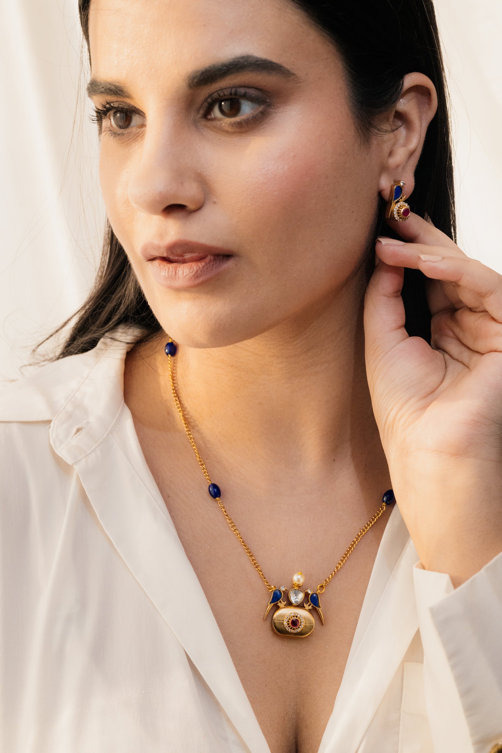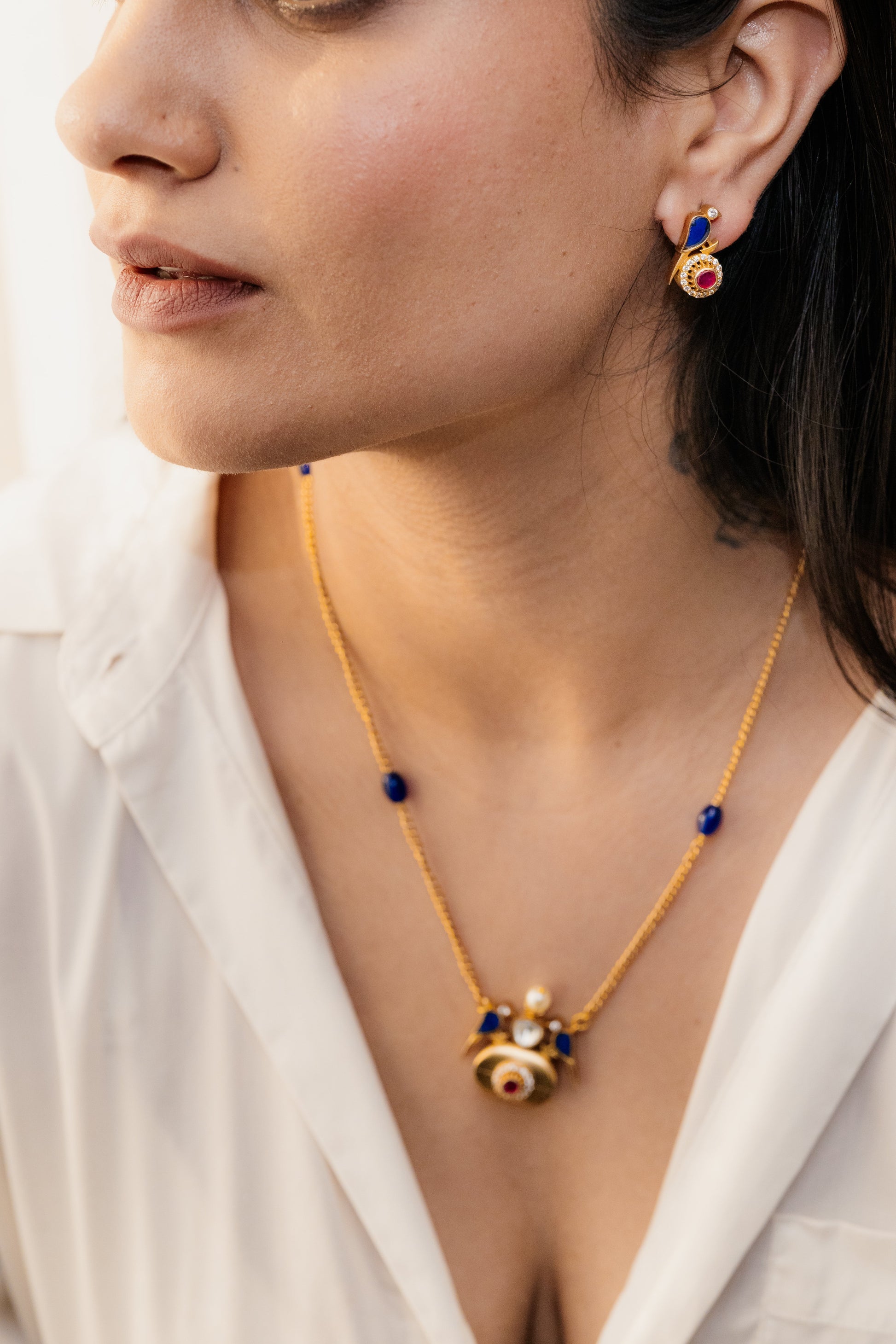 Blue stone & gold plated motif neck string with earrings