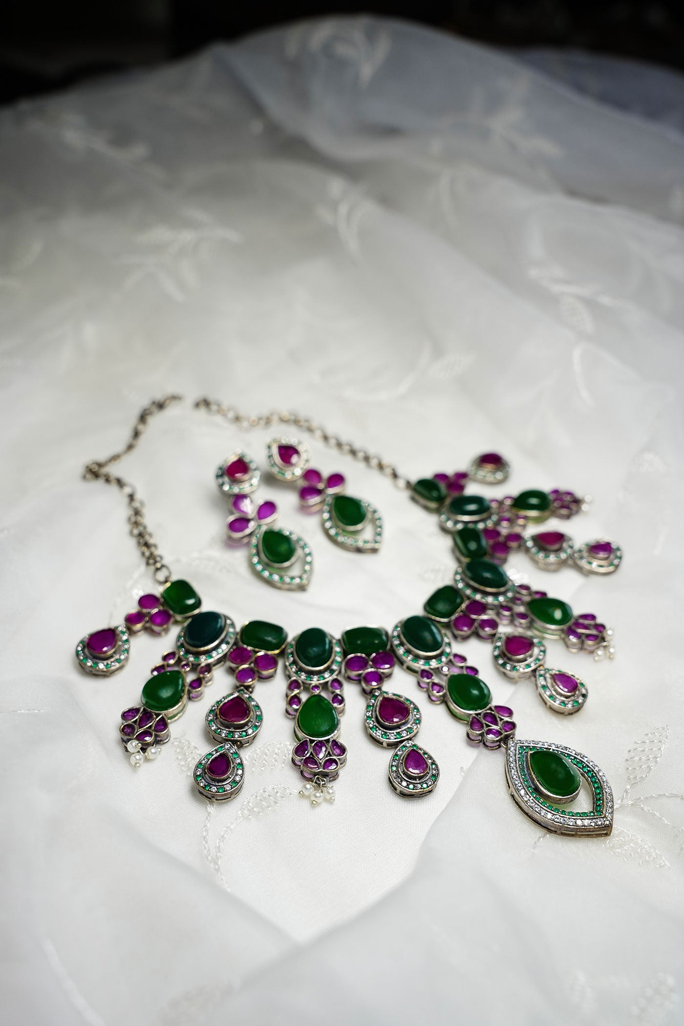 A symphony of rich green and amethyst-toned stones, the Raag Set is a bold nod to Indian classical elegance. Intricately set with silver-toned detailing and finished with soft pearl drops-Let it shine against deep hues or timeless blacks — perfect for festive nights or modern heirloom dressing.