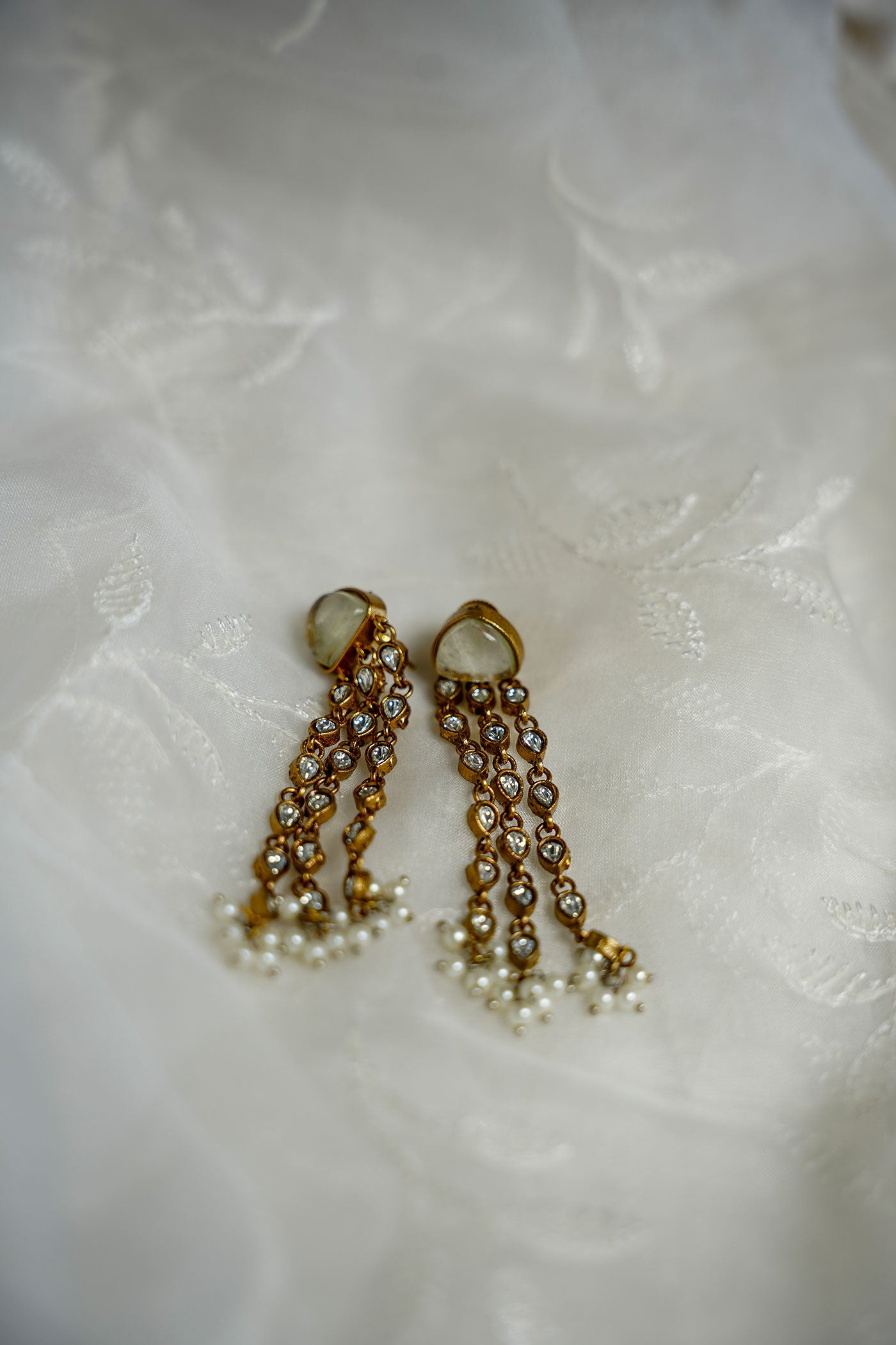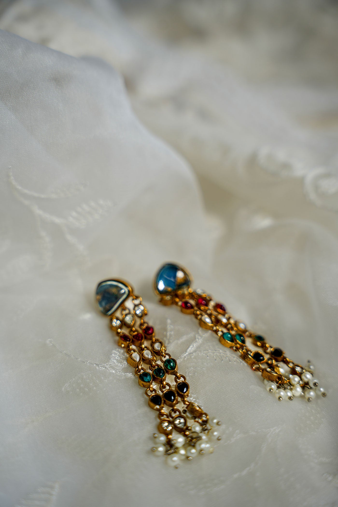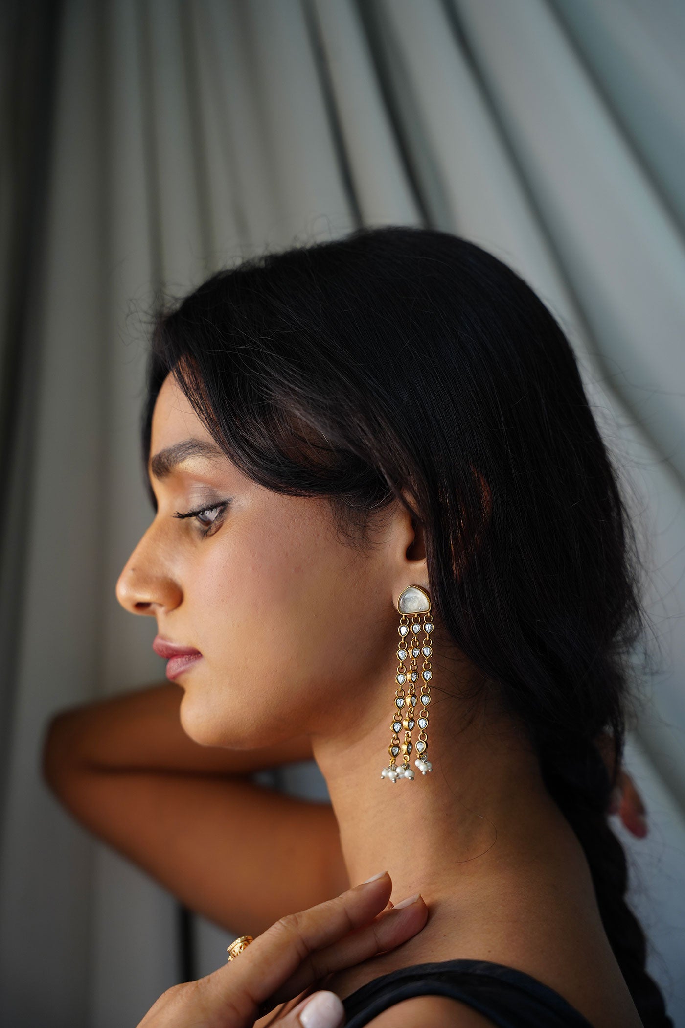 Light, fluid, and full of rhythm — the Raahi Earrings are designed to move with you. Featuring rows of hand-linked beads in warm, earthy tones and finished with tiny pearl drops, these gold-tone danglers are equal parts playful and elegant - Let them dance with a sleek bun and soft, dewy makeup — perfect for evening mehendi looks or an intimate wedding brunch.