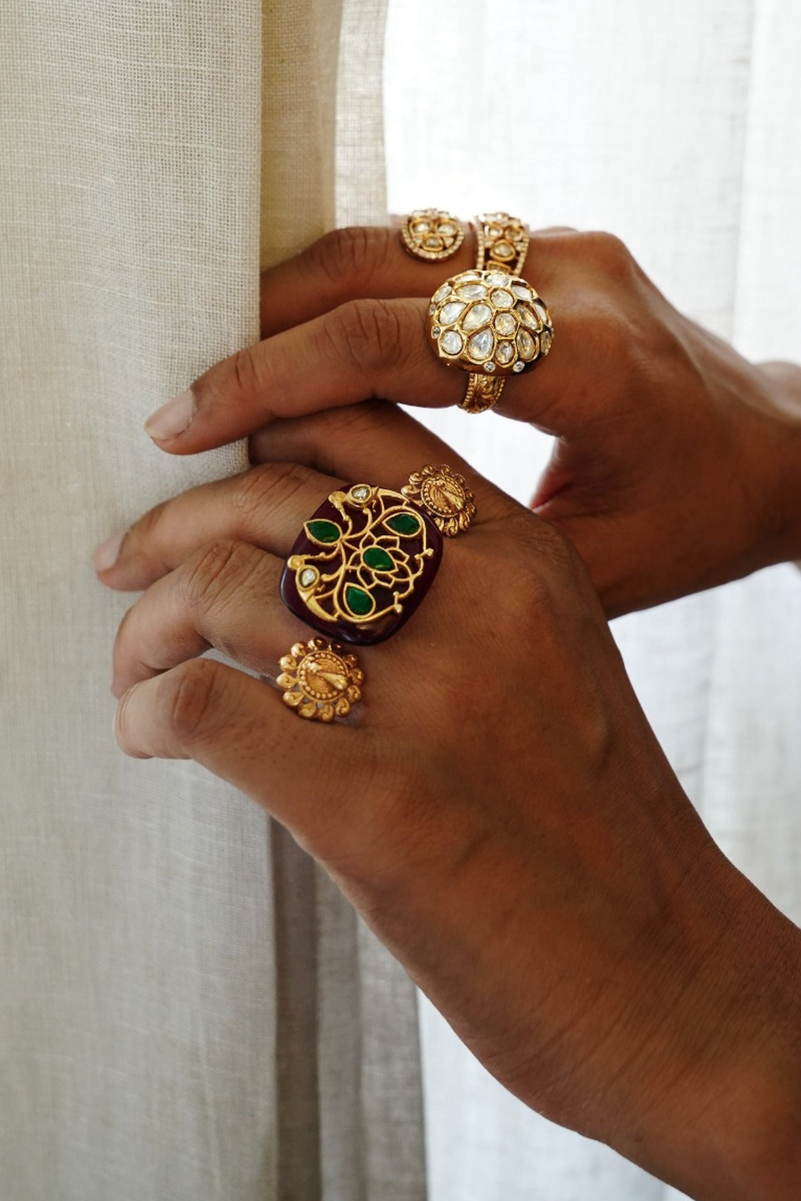 Featuring vivid green kundan stones nestled in a floral jaali over deep ruby-red enamel stone, this oversized double finger ring is handcrafted to be the focal point of your look