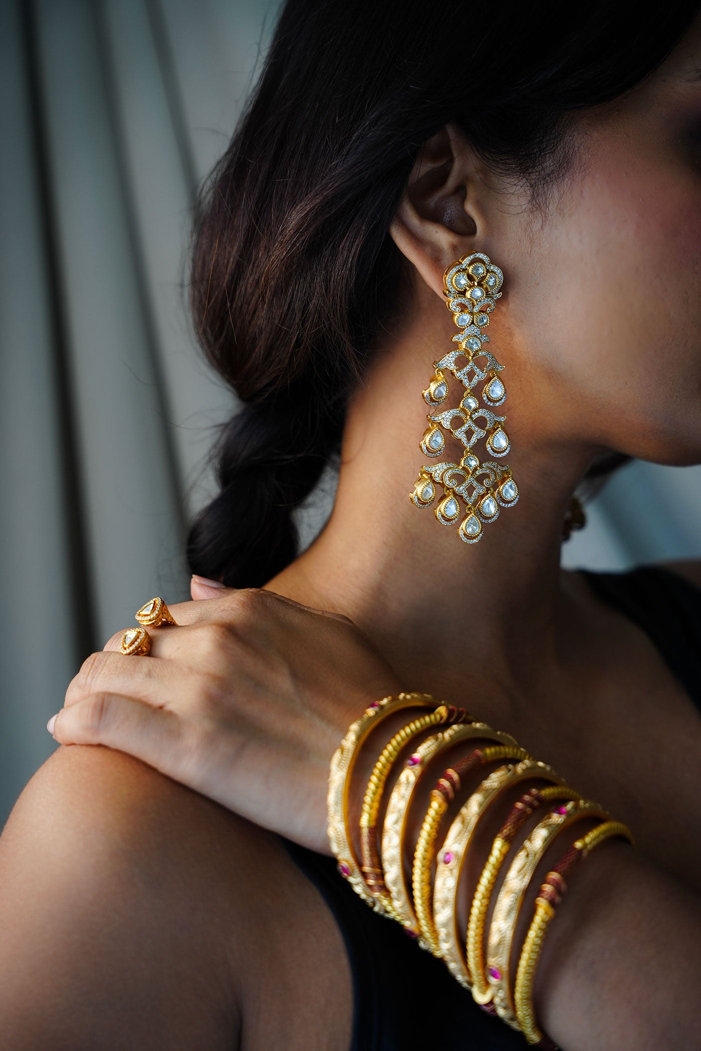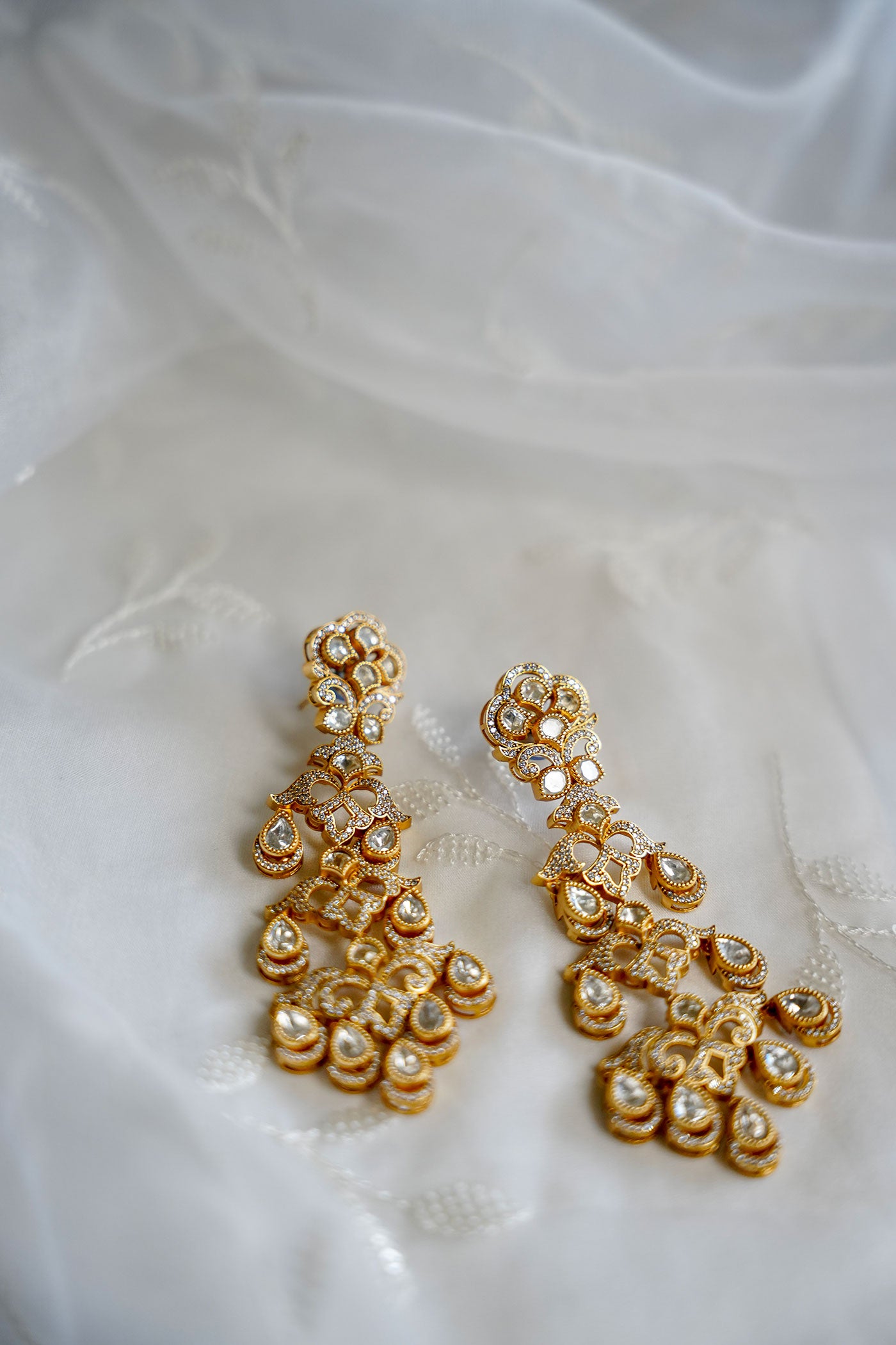 The Sheesh Tara earrings are a celebration of mirror-like kundan brilliance — a cascade of shimmering stones set in antique gold - Let them sparkle against a swept-up bun, embroidered dupatta. Ideal for wedding nights & festivities.