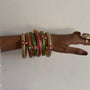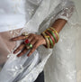 Crafted with striking ruby red and emerald green accents on solid brass material, gold plated secured with floral motif at the center adds a playful yet classic detail, making them perfect for festive dressing or to add a stunning stack on your wrist.