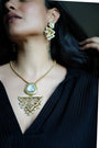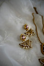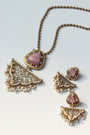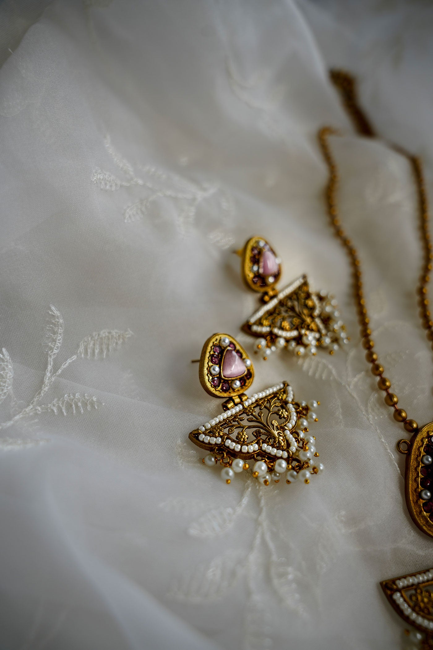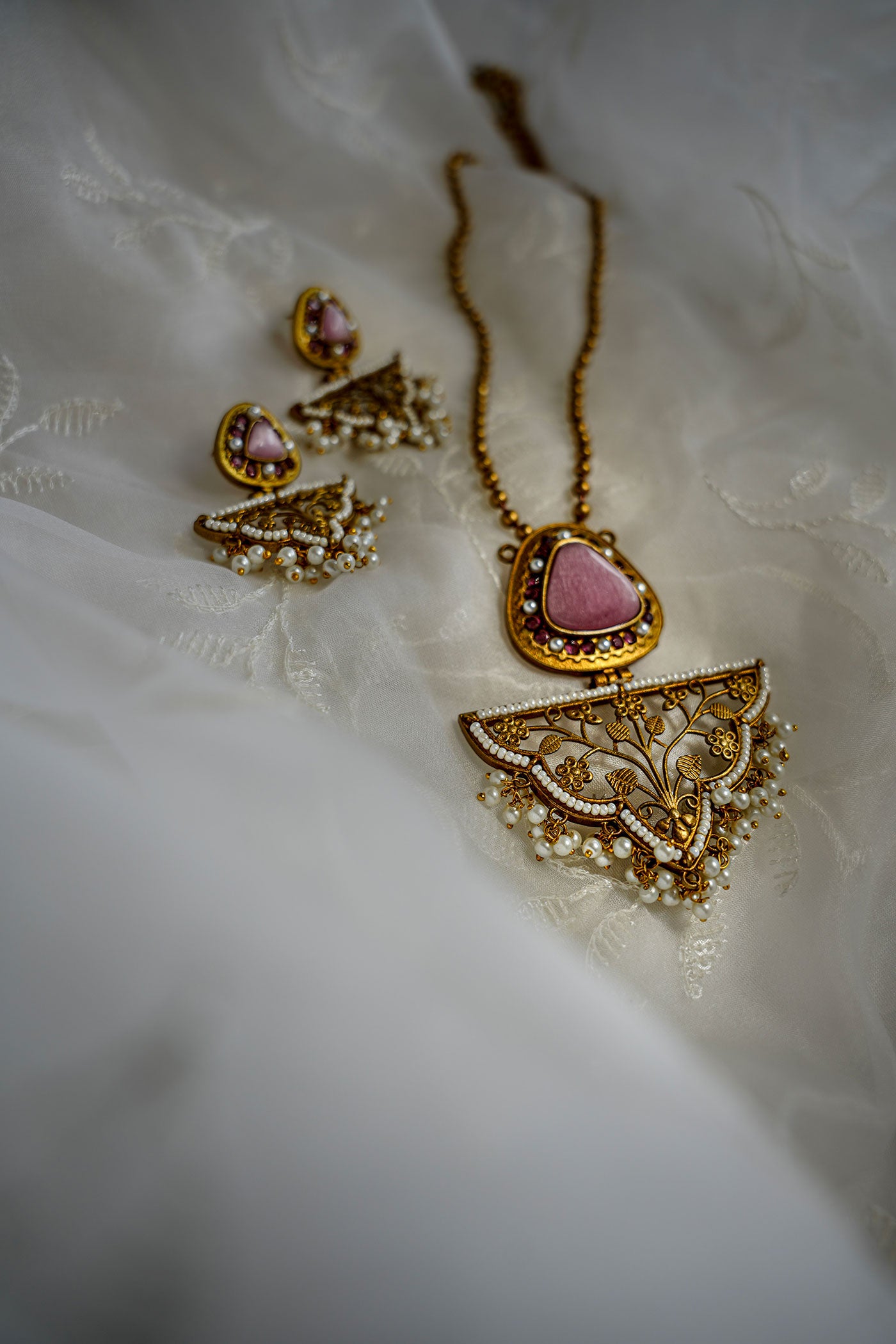 Light as a dream and rich in detail. A blush pink teardrop stone sits at the heart of both the pendant and earrings, framed with tiny kundan work and suspended from a fan-shaped filigree piece laced with dainty pearl drops - Perfect for pastel lehengas, floral saris, or a classic ivory suit. Style it with soft curls, flushed cheeks, and minimal makeup for a dreamy look.