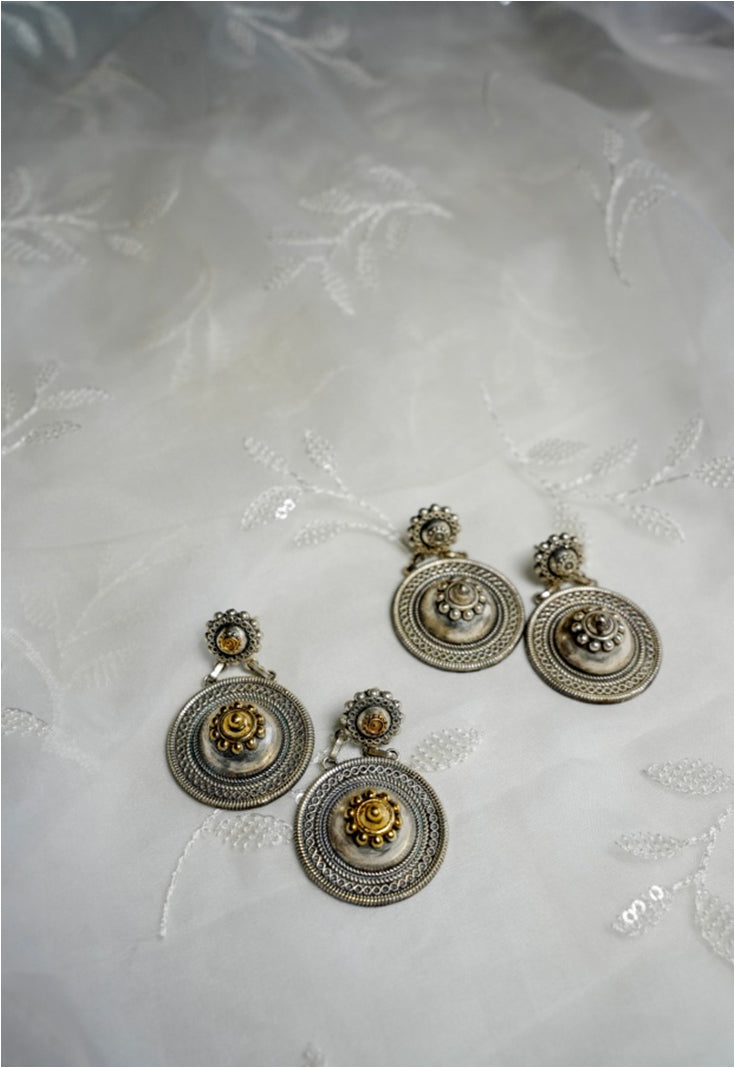 With their bold circular form and intricate gold detailing on german silver, the Taru Earrings channel old-soul elegance -Best worn with pulled-back hair and minimal layers to let the design speak. Think cotton sarees, oversized shirts, or monotone sets.