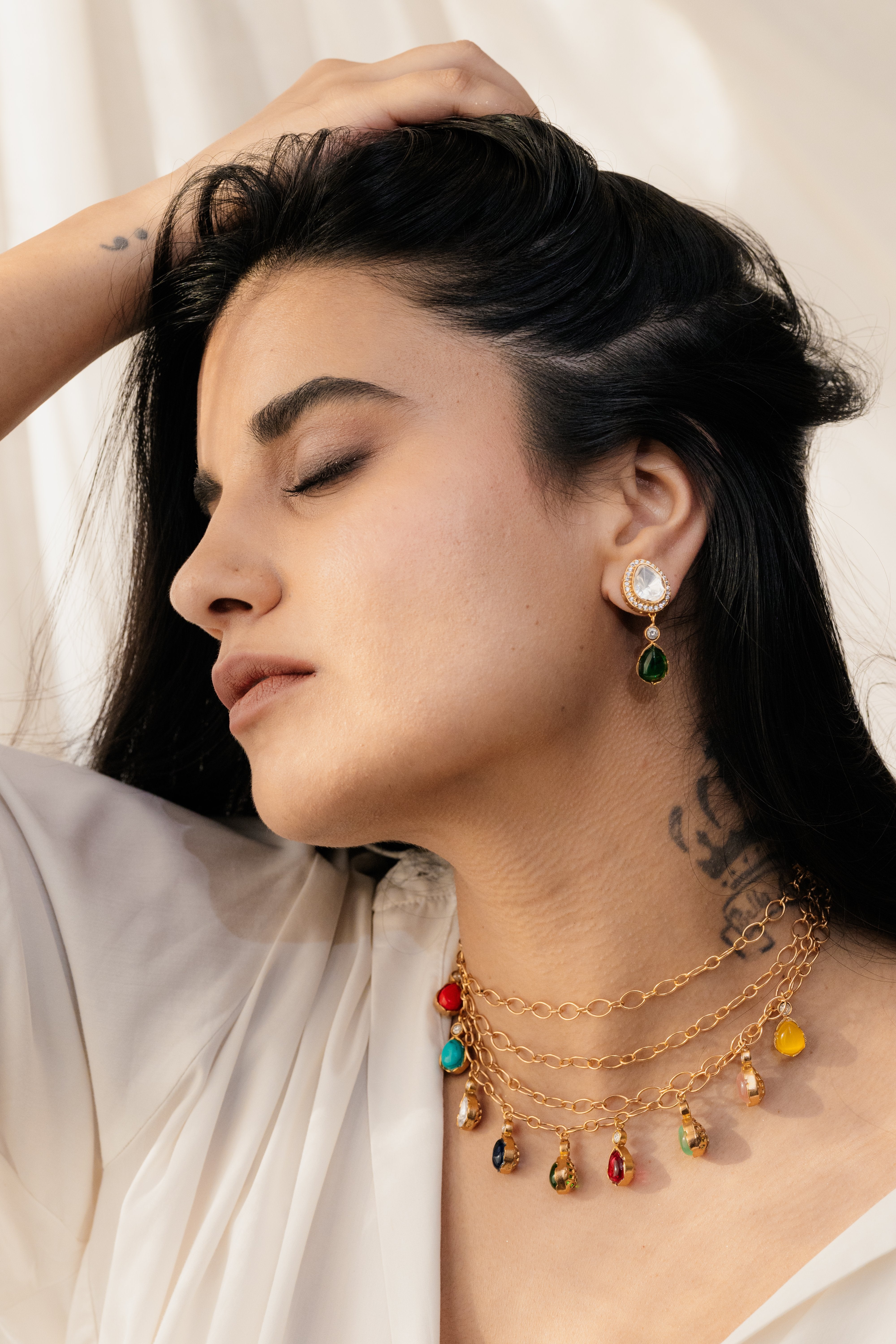 Three layered choker with Navratna stones & earrings.