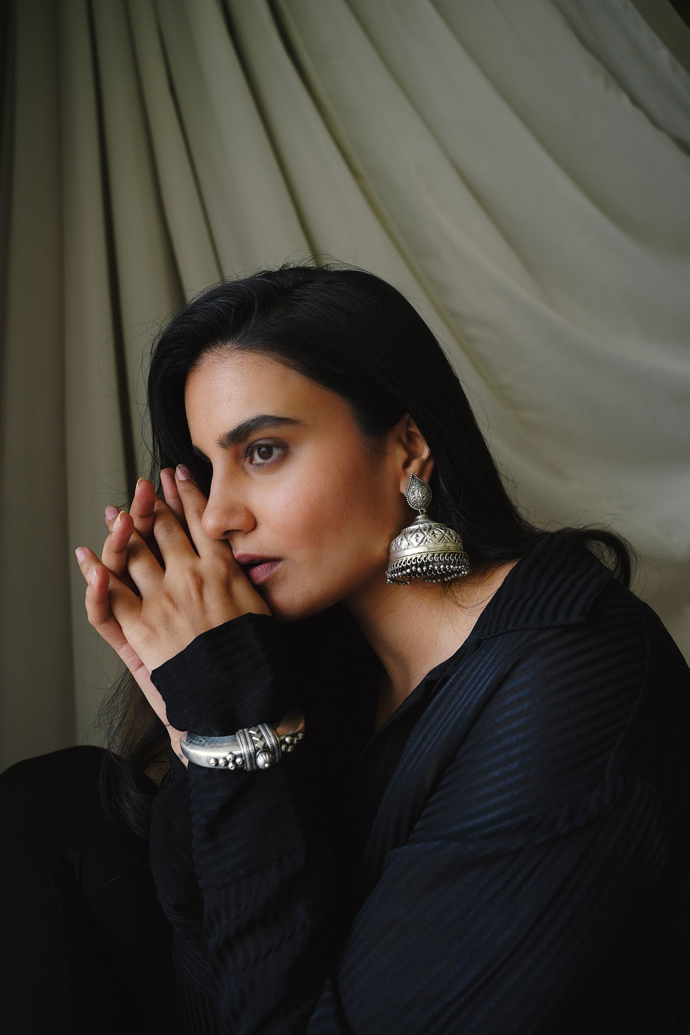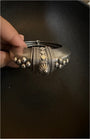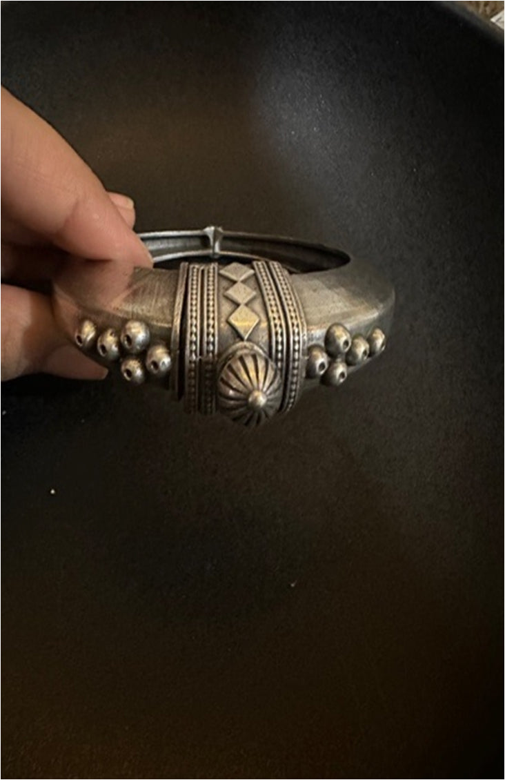 Chunky, confident, and full of character — this oxidised cuff bangle is inspired by traditional tribal ornamentation but pared down just enough for the modern wardrobe. Hand-cast in a german silver-tone alloy and detailed with raised beads and sunburst motifs, it holds a raw, earthy presence - let it stand alone next to a black kurta or oversized shirt.