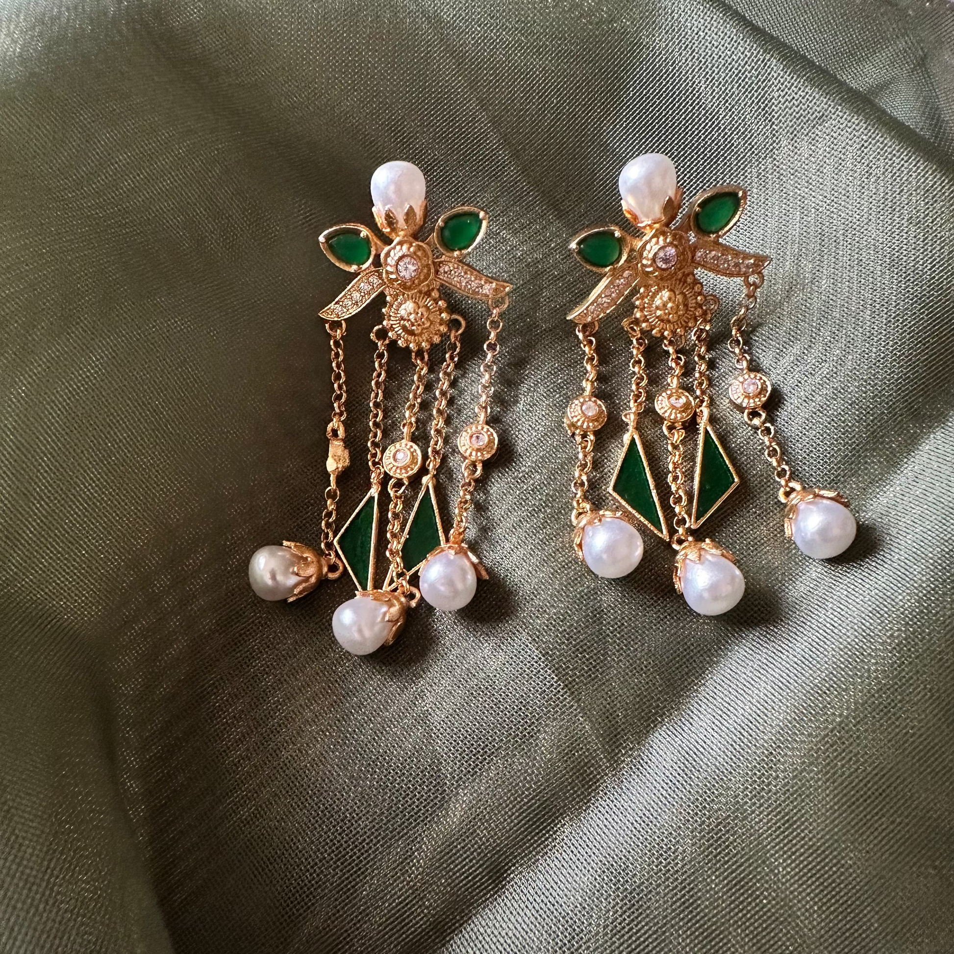 A fusion Indian intricately set emeralds & ruby stone with pearls, to give it a Indo western feel that goes both with your festive fits & elevated basics.